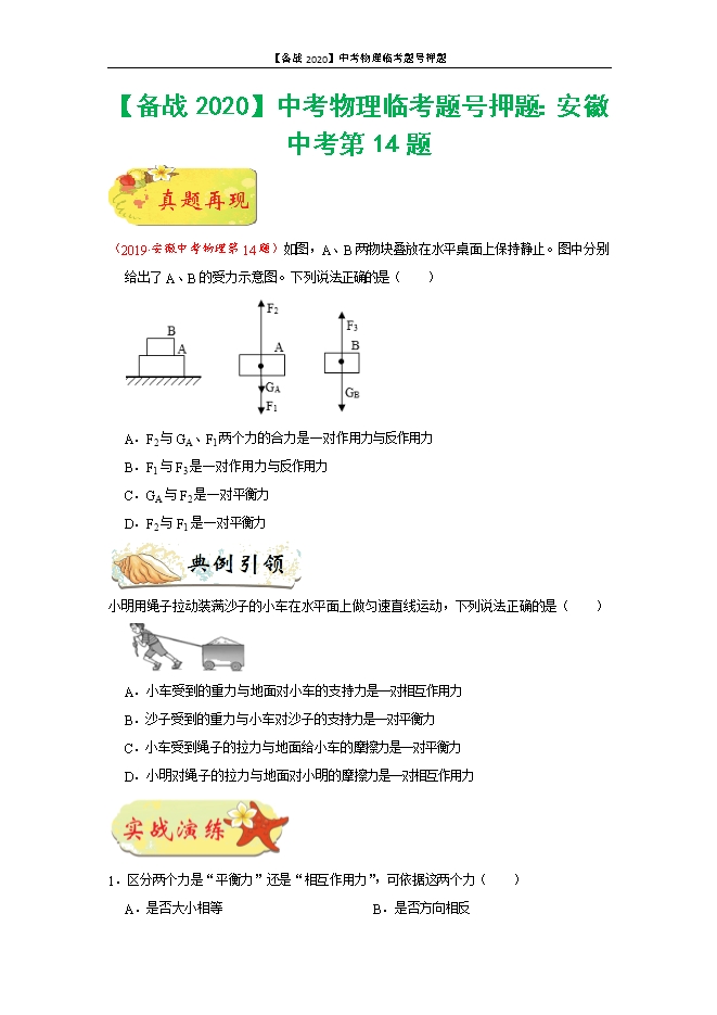 【内容简介】如图,A、B两物块叠放在水平桌面上保持静止。图中分别给出了A、B的受力示意图。下列说法正确的是( ) A.F2与GA、F1两个力的合力是一对作用力与反作用力B.F1与F3是一对作用力与反作用力C.GA与F2是一对平衡力D.F2与F1是一对平衡力【答案】B【解析】由图知,A物块受到向上的支持力F2、向下的重力GA、B对A向下的压力F1;B物块受到向上的支持力F3和向下的重力GB,A、以A为研究对象,A物块在水平桌面上保持静止,受力平衡;GA、F1两个力的合力方向向下,合力的大小GA+F1=F2,则可知F2与GA、F1两个力的合力大小相等、方向相反、作用在同一条直线上,均作用在A物块上,所以是一对平衡力,不是一对相互作用力,故A错误;B、B对A有向下的压力F1,因力的作用是相互的,则A对B有向上的支持力F3,所以F1与F3是一对作用力与反作用力,故B正确;C、A物块处于静止状态,由图示和力的平衡条件可得:F2=GA+F1,则GA与F2的大小不等,所以GA与F2不是一对平衡力,故C错误;D、A物块处于静止状态,由力的平衡条件可得:F2=GA+F1,则F2与F1的大小不等,所以F2与F1不是一对平衡力,故D错误。故选:B。 小明用绳子拉动装满沙子的小车在水平面上做匀速直线运动,下列说法正确的是( ) A.小车受到的重力与地面对小车的支持力是一对相互作用力B.沙子受到的重力与小车对沙子的支持力是一对平衡力C.小车受到绳子的拉力与地面给小车的摩擦力是一对平衡力D.小明对绳子的拉力与地面对小明的摩擦力是一对相互作用力【答案】B【解析】A、小车受到的重力与地面对小车的支持力是作用在同一个物体上,且大小不等,不是一对相互作用力,故A错误;B、沙子受到的重力与小车对沙子的支持力大小相等、方向相反、作用在同一个物体上,作用在同一条直线上,是一对平衡力,故B正确;C、读图可知,小车受到绳子的拉力与地面给小车的摩擦力没有作用在同一直线上,不属于平衡力,故C错误;D、读图可知,小明对绳子的拉力与地面对小明的摩擦力没有作用在同一直线上,不是一对相互作用力。故D错误。故选:B。 1.区分两个力是“平衡力”还是“相互作用力”,可依据这两个力( )A.是否大小相等B.是否方向相反C.是否作用在同一物体上D.是否作用在同一直线上【答案】C【解析】平衡力和相互作用力最大的区别在于:平衡力作用在一个物体上,而相互作用力作用在两个物体上,所以判断是平衡力还是非平衡力需要观察这两个力是否作用在同一个物体上。故选:C。2.在2019年,举重世界杯男子96公斤级比赛中,我国选手田涛以挺举230公斤、总成绩410公斤荣获总成绩和挺举两项冠军。如图所示是田涛举着杠铃稳定站立时的照片,下列说法中正确的是( ) A.杠铃对人的压力和人对杠铃的支持力是一对平衡力B.杠铃受到的重力和人对杠铃的支持力是一对平衡力C.人受到的重力和地面对人的支持力是一对平衡力D.人受到的重力和人对地面的压力是一对相互作用力......