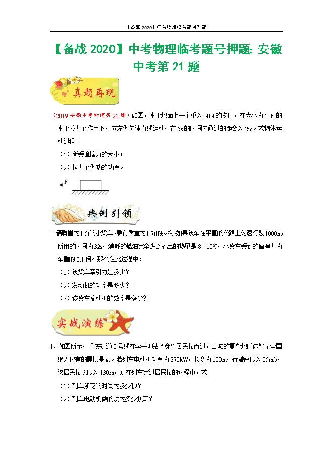 【内容简介】如图,水平地面上一个重为50N的物体,在大小为10N的水平拉力F作用下,向左做匀速直线运动,在5s的时间内通过的距离为2m。求物体运动过程中(1)所受摩擦力的大小;(2)拉力F做功的功率。 【答案】(1)所受摩擦力的大小为10N;(2)拉力F做功的功率为4W。【解析】(1)用10N的水平拉力,拉着物体向左做匀速直线运动,物体处于平衡状态,则地面对物体的摩擦力与拉力是一对平衡力,大小相等,故f=F=10N;(2)拉力F做的功:W=Fs=10N×2m=20J,拉力F做功的功率:P= = =4W。 一辆质量为1.5t的小货车,载有质量为1.7t的货物,如果该车在平直的公路上匀速行驶1000m,所用的时间为32s,消耗的燃油完全燃烧放出的热量是8×106J,小货车受到的摩擦力为车重的0.1倍。那么在此过程中:(1)该货车牵引力是多少?(2)发动机的功率是多少?(3)该货车发动机的效率是多少?【答案】(1)该货车牵引力是3.2×103 N;(2)发动机的功率是1×105W;(3)该货车发动机的效率是40%。【解析】由题意可知,m车 =1.5 t=1.5×103 kg,m货 =1.7 t=1.7×103 kg,s=1000 m,t=32s,Q=8×106J;(1)因货车在平直的公路上匀速行驶,所以牵引力和阻力是一对平衡力,则该货车受到的牵引力:F=f=0.1G总=0.1(m车 +m货)g=0.1×(1.5×103 kg+1.7×103 kg)×10 N/kg=3.2×103 N;(2)牵引力做功:W=Fs=3.2×103 N×1000 m=3.2×106 J,则发动机的功率:P= = =1×105W;(3)发动机的效率:η= = ×100%=40%。 1.如图所示,重庆轨道2号线在李子坝站“穿”居民楼而过,山城的复杂地形造就了全国绝无仅有的震撼景象。若列车电动机功率为370kW,长度为120m,行驶速度为25m/s,该居民楼长度为130m,则在列车穿过居民楼的过程中,求(1)列车所花的时间为多少秒?(2)列车电动机做的功为多少焦耳? 【答案】(1)列车所花的时间为10s;(2)列车电动机做的功为3.7×106J。【解析】(1)列车穿过居民楼时通过的路程:s=L车+L居民楼=120m+130m=250m,由v= 可得,列车穿过居民楼的时间:......