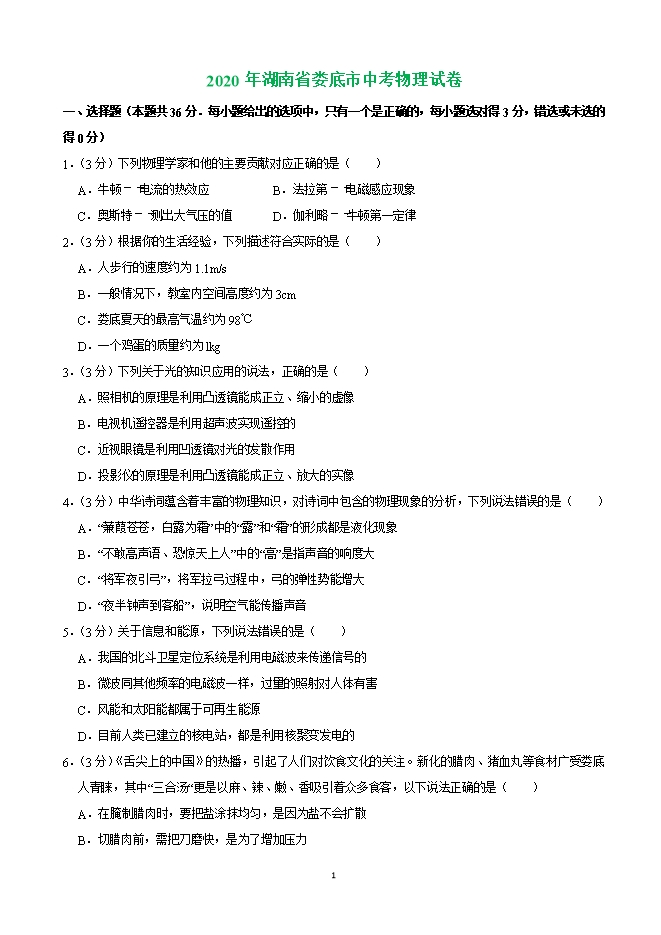 2020年湖南省娄底市初中学业水平考试物理试题及答案解析(word版)