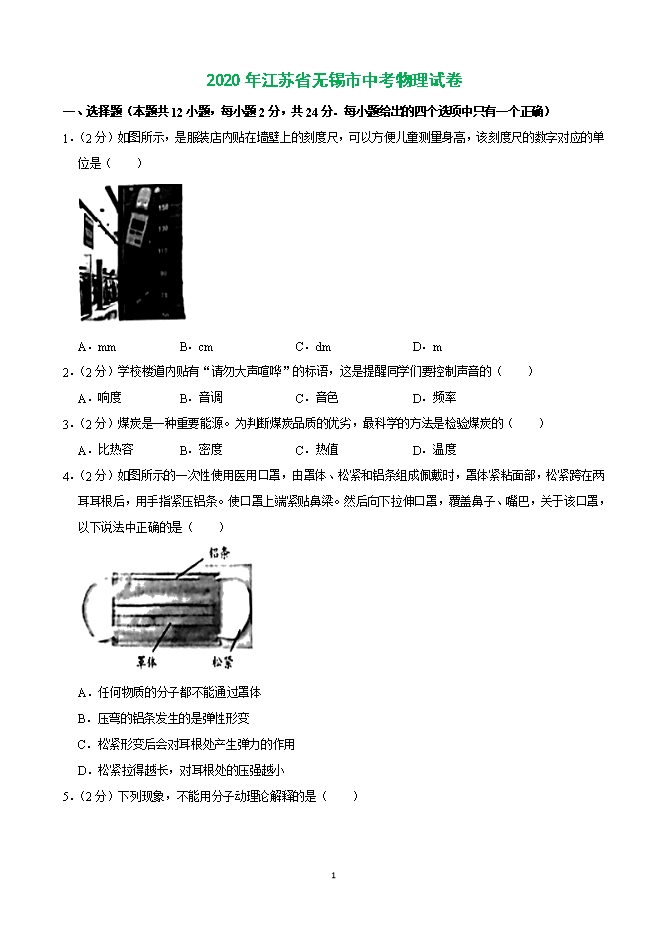【内容简介】一、选择题(本题共12小题,每小题2分,共24分.每小题给出的四个选项中只有一个正确)1.(2分)如图所示,是服装店内贴在墙壁上的刻度尺,可以方便儿童测量身高,该刻度尺的数字对应的单位是( ) A.mmB.cmC.dmD.m2.(2分)学校楼道内贴有“请勿大声喧哗”的标语,这是提醒同学们要控制声音的( )A.响度B.音调C.音色D.频率3.(2分)煤炭是一种重要能源。为判断煤炭品质的优劣,最科学的方法是检验煤炭的( )A.比热容B.密度C.热值D.温度4.(2分)如图所示的一次性使用医用口罩,由罩体、松紧和铝条组成佩戴时,罩体紧粘面部,松紧跨在两耳耳根后,用手指紧压铝条。使口罩上端紧贴鼻梁。然后向下拉伸口罩,覆盖鼻子、嘴巴,关于该口罩,以下说法中正确的是( ) A.任何物质的分子都不能通过罩体B.压弯的铝条发生的是弹性形变C.松紧形变后会对耳根处产生弹力的作用D.松紧拉得越长,对耳根处的压强越小5.(2分)下列现象,不能用分子动理论解释的是( ) A.水和酒精混合后总体积变小B.红墨水在水中散开C.铅块紧压后粘在一起D.丝绸摩擦过的玻璃棒吸引纸屑6.(2分)用如图所示的装置探究光的反射规律。纸板由E、F两部分组成,可以绕ON翻折,为了探究反射角与入射角大小的关系,应进行的操作是( ) A.改变光线AO与ON的夹角B.沿ON向后转动纸板FC.改变纸板与平面镜之间的夹角D.沿ON向后转动纸板E7.(2分)关于内能,下列说法中正确的是( )A.0℃的冰块没有内能B.物体内能大小与温度无关C.热量总是从内能大的物体向内能小的物体转移D.金属汤勺放在热汤中,温度升高,这是通过热传递的方式改变内能