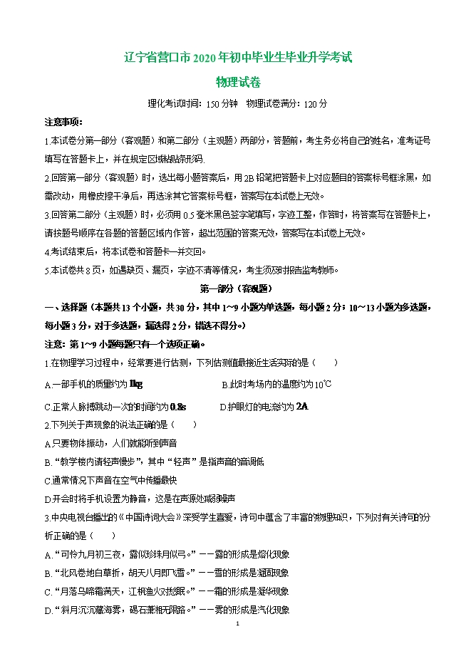【内容简介】理化考试时间:150分钟 物理试卷满分:120分注意事项:1.本试卷分第一部分(客观题)和第二部分(主观题)两部分,答题前,考生务必将自己的姓名,准考证号填写在答题卡上,并在规定区域粘贴条形码.2.回答第一部分(客观题)时,选出每小题答案后,用2B铅笔把答题卡上对应题目的答案标号框涂黑,如需改动,用橡皮擦干净后,再选涂其它答案标号框,答案写在本试卷上无效。3.回答第二部分(主观题)时,必须用0.5毫米黑色签字笔填写,字迹工整,作答时,将答案写在答题卡上,请按题号顺序在各题的答题区域内作答,超出范围的答案无效,答案写在本试卷上无效。4.考试结束后,将本试卷和答题卡一并交回。5.本试卷共8页,如遇缺页、漏页,字迹不清等情况,考生须及时报告监考教师。第一部分(客观题)一、选择题(本题共13个小题,共30分,其中1~9小题为单选题,每小题2分;10~13小题为多选题,每小题3分,对于多选题,漏选得2分,错选不得分。)注意:第1~9小题每题只有一个选项正确。1.在物理学习过程中,经常要进行估测,下列估测值最接近生活实际的是( )A.一部手机的质量约为 B.此时考场内的温度约为10℃C.正常人脉搏跳动一次的时间约为 D.护眼灯的电流约为 2.下列关于声现象的说法正确的是( )A.只要物体振动,人们就能听到声音B.“教学楼内请轻声慢步”,其中“轻声”是指声音的音调低C.通常情况下声音在空气中传播最快D.开会时将手机设置为静音,这是在声源处减弱噪声3.中央电视台播出的《中国诗词大会》深受学生喜爱,诗句中蕴含了丰富的物理知识,下列对有关诗句的分析正确的是( )A.“可怜九月初三夜,露似珍珠月似弓。”——露的形成是熔化现象B.“北风卷地白草折,胡天八月即飞雪。”——雪的形成是凝固现象C.“月落乌啼霜满天,江枫渔火对愁眠。”——霜的形成是凝华现象D.“斜月沉沉藏海雾,碣石潇湘无限路。”——雾的形成是汽化现象4.2020年3月8日,国际乒联卡塔尔公开赛中,国乒以总成绩4冠1亚完美收官。值得一提的是,赛前马龙召集所有参赛队员讨论,大家一致决定将获得的奖金全部捐献给武汉抗疫前线,如图所示为马龙参赛时的情景,下列说法中正确的是( ) A.击球时,力改变了乒乓球的运动状态D.拍球时,球拍对球的力大于球对球拍的力C.球拍将球击出后,乒乓球受到惯性的作用继续运动D.乒乓球在空中运动过程中受到平衡力的作用5.下列说法中正确的是( )A.近视眼镜对光线有会聚作用B.反射光线、入射光线和法线在同一平面内C.一束太阳光可以通过三棱镜分解为三种色光D.镜面反射遵循光的反射定律,漫反射不遵循光的反射定律6.下列关于能源、材料的说法正确的是( )A.煤是可再生能源,燃煤发电容易造成环境污染B.红沿河核电站是我省第一座核电站,它利用核聚变发电C.利用率导体材料可以制作二极管、三极管D.超导材料可应用于电饭锅的电热丝