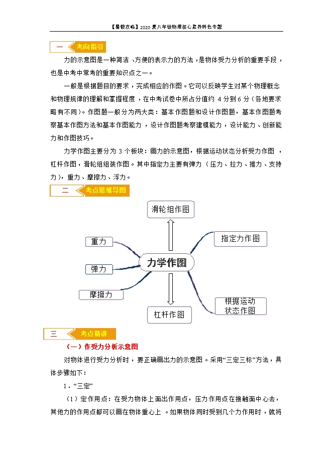 【内容简介】一 考向指引力的示意图是一种简洁、方便的表示力的方法,是物体受力分析的重要手段,也是中考中常考的重要知识点之一。一般是根据题目的要求,完成相应的作图。它可以反映学生对某个物理概念和物理规律的理解和掌握程度,在中考试卷中所占分值约4分到6分(各地要求略有不同)。作图题一般分为两大类:基本作图题和设计作图题,基本作图题考察基本作图方法和基本作图能力,设计作图题考察建模能力,设计能力、创新能力和作图技巧。力学作图主要分为3个板块:画力的示意图,根据运动状态分析受力作图,杠杆作图,滑轮组组装作图。其中指定力主要有弹力(压力、拉力、推力、支持力),重力、摩擦力、浮力。二 考点思维导图 三 考点精讲(一)作受力分析示意图对物体进行受力分析时,要正确画出力的示意图。采用“三定三标”方法,具体步骤如下:1.“三定”(1)定作用点:在受力物体上面出作用点,压力作用点在接触面中心去,其他力的作用点都可以画在物体重心上。如果物体同时受到几个力作用时,就将重心作为这几个力的作用点。(2)定方向:以作用点为起点,沿力的方向画线段。常见力的方向描述,如重力方向竖直向下,摩擦力方向与物体相对运动或相对趋势方向相反,压力、支持力方向与受力面垂直指向受力物体,拉力方向沿着绳子收缩的方向等。(3)定长度:尽管长度不能准确的反映力的大小,但在同一图中,如果物体受到几个力的作用时,线段的长短要大致表示力的大小,力越大,线段应画得越长。一对平衡力线段长度相同。2.“三标”(1)标箭头:在线段的末端标上箭头表示力的方向。(2)标符号:力一般用字母“F”表示,重力用符号“ ”表示。摩擦力一般用“ ”表示。(3)标数值和单位:若有力的大小,还应该在箭头旁边标上力的数值和单位。3.画力的示意图需注意的问题(1)力的作用点一定要画在受力物体上,一般情况下,压力的作用点画在接触面上,其他力的作用点均可画在物体重心上(若是摩擦力使物体转动,则摩擦力只能画在接触面上),指定作用点的,只能画在指定作用点上。当一个物体受多个力作用时,这几个力的作用点都要画在物体的重心上。(2)在画力的示意图时,要正确分析物体的受力情况,若找不出一个力的施力物体,则该力一定是不存在的。根据要求画出需要画的力(下一个专题详解)。(3)受力分析的顺序:先分析重力,然后环绕物体一周找出与研究对象接触的物体,并逐个分析这些物体对研究对象的弹力和摩擦力,最后分析其他力。简记为:重力一定有,弹力看四周,分析摩擦力,再看电磁浮。