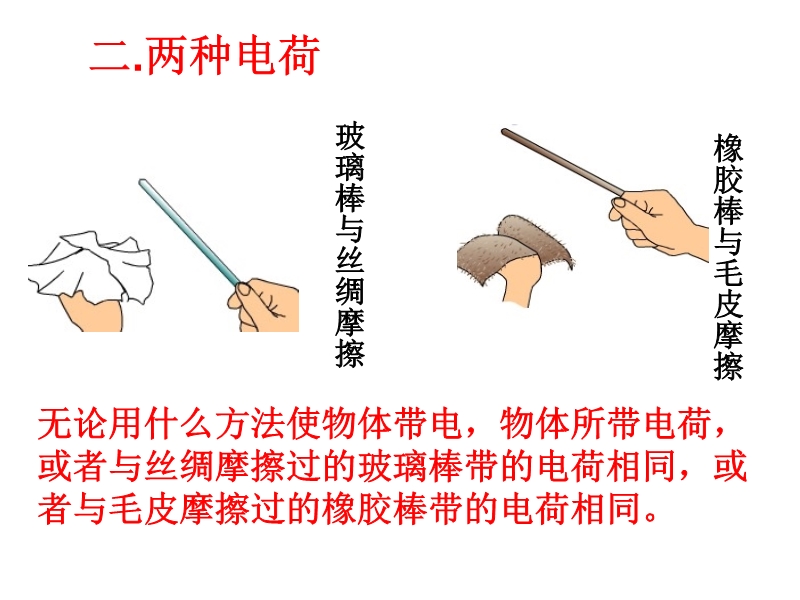 【内容简介】【演示实验】如图所示,展示一个塑料捆扎绳,用小刀划成细丝状,用手捋几次,你会发现什么现象?能把塑料捆扎绳梳理整齐吗?回答:不能,捋的次数越多反而越散.为什么越理越乱呢?从这节课开始,我们就进入电的世界,认识有关电学的知识.一、摩擦起电通过摩擦使物体带电的方法叫做摩擦起电。被丝绸摩擦的玻璃棒能吸轻小物体说明带电;被毛皮摩擦的橡胶棒能吸轻小物体说明带电。一些物体被摩擦后,能够吸引轻小物体,人们把这种现象称为物体带了电,或者说带了“电荷”。1.摩擦起电:用摩擦的方法使物体带电,叫摩擦起电。2.带电体的性质:带电体能吸引轻小物体。注:使物体带电的方法:1.摩擦起电 2.接触起电 3.感应起电