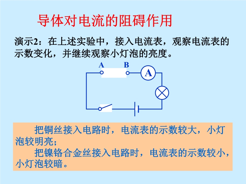 【内容简介】导线多是用铜制作的,特别重要的电器设备的导线还要用昂贵的银来做。铁也是导体,既多又便宜,想想看,为什么不用铁来制作导线呢?导体对电流的阻碍作用演示1:把长短、粗细相同的铜丝和镍铬合金丝分别接入电路,闭合开关,观察电路中小灯泡的亮度。演示2:在上述实验中,接入电流表,观察电流表的示数变化,并继续观察小灯泡的亮度。把铜丝接入电路时,电流表的示数较大,小灯泡较明亮; 把镍铬合金丝接入电路时,电流表的示数较小,小灯泡较暗。 在相同的条件下,通过铜丝的电流比镍铬合金丝的大,为什么会有这种差别呢?导体在导电的同时,对电流有阻碍作用,且不同导体对电流的阻碍作用可以不同。一、电阻(R)1、概念 导体对电流阻碍作用大小。导体的电阻用字母 R 表示。导体的电阻越大,表示导体对电流的阻碍作用越大。2.国际制单位:欧姆,简称欧,符号为Ω。常用单位:千欧(KΩ) 兆欧(MΩ)1KΩ=1000Ω 1MΩ=1000KΩ 1MΩ=106 Ω