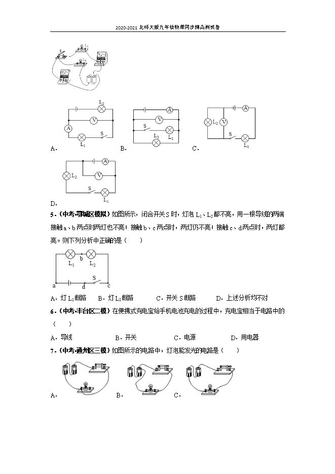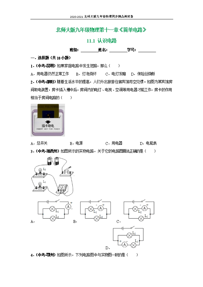 【内容简介】1.(中考•昆明)如果家庭电路中发生短路,那么( )A.用电器仍然正常工作 B.灯泡烧坏C.电灯发暗 D.保险丝烧断【答案】D。【解析】(1)如果家庭电路中发生短路,没有电流流过用电器,则用电器不能正常工作,灯泡不会烧坏,故ABC错误;(2)保险丝在电路中的作用是当电路中有过大电流通过时,保险丝发热自动熔断,切断电路,从而起到保护电路的作用。故D正确。2.(中考•邵阳)随着生活水平的提高,人们外出旅游住宿宾馆司空见惯。如图为某宾馆房间取电装置,房卡插入槽中后,房间内的电灯、电视、空调等用电器才能工作,房卡的作用相当于房间电路的( ) A.总开关B.电源C.用电器D.电能表【答案】A。【解析】房卡可以控制用电器的工作,不插入插槽中,所有房间内的用电器都不工作,所以房卡相当家庭电路的总开关,故A正确。3.(中考•湘西州)如图所示的实物电路,关于它的电路图画法正确的是( ) A. B. C. D. 【答案】C。【解析】由实物图可知,两灯泡并联,电流表测量灯泡L2支路的电流;开关在干路上;A、此图中两灯泡并联,电流表在干路上,故A不符合题意。B、此图中两灯泡是并联的,电流表测量灯泡L1支路的电流,电流表正负接线柱连接正确,开关在干路上;故B不符合题意;C、此图中两灯泡是并联的,电流表测量灯泡L2支路的电流,电流表正负接线柱连接正确,开关在干路上;故C符合题意;D、此图中两灯泡是并联的,电流表测量灯泡L1支路的电流,但电流表正负接线柱连接错误,开关在干路上;故D不符合题意;4.(中考•鄂州)如图所示,下列电路图中与实物图一致的是( ) A. B. C. D. 【答案】A。【解析】由实物图可知,电流从电源的正极出发,经过电流表、灯泡L1,再经过开关,灯泡L2回到负极,电压表并联在电流表、灯泡L1、开关的两端。A、由电路图可知,两灯泡串联,电流从电源的正极出发,经过电流表、灯泡L1,再经过开关,灯泡L2回到负极,电压表并联在电流表、灯泡L1、开关的两端,与实物图符合,故A正确;B、由电路图可知,两灯泡并联,与实物图不符,故B错误;C、由电路图可知,两灯泡串联,电压表测量灯泡L2两端电压,实物图中电压表测量灯泡L1两端电压,与实物图不符,故C错误;D、由电路图可知,两灯泡串联,电压表测量灯泡L2和L1两端电压,与实物图不符,故D错误;5.(中考•鄂城区模拟)如图所示,闭合开关S时,灯泡L1、L2都不亮,用一根导线的两端接触a、b两点时两灯也不亮;接触b、c两点时,两灯仍不亮;接触c、d两点时,两灯都亮。则下列分析中正确的是( ) A.灯L1断路B.灯L2断路C.开关S断路D.上述分析均不对【答案】C。【解析】A、如果灯L1断路,用一段导线的两端接触a、b两点时,L2会发光。故A不符合题意;B、如果灯L2断路,导线接触b、c两点时,L1会发光。故B不符合题意;C、如果开关断路,导线接触c、d两点时,电路是通路,两灯都发光。故C符合题意;D、由ABC可知,D不符合题意。6.(中考•丰台区二模)在便携式充电宝给手机电池充电的过程中,充电宝相当于电路中的( )A.导线B.开关C.电源D.用电器【答案】C。【解析】在便携式充电宝给手机电池充电的过程中,电能由充电宝转移到手机电池,在电路中手机电池消耗电能相当于用电器,而充电宝提供了电能相当于电源,故C正确、ABD错误。