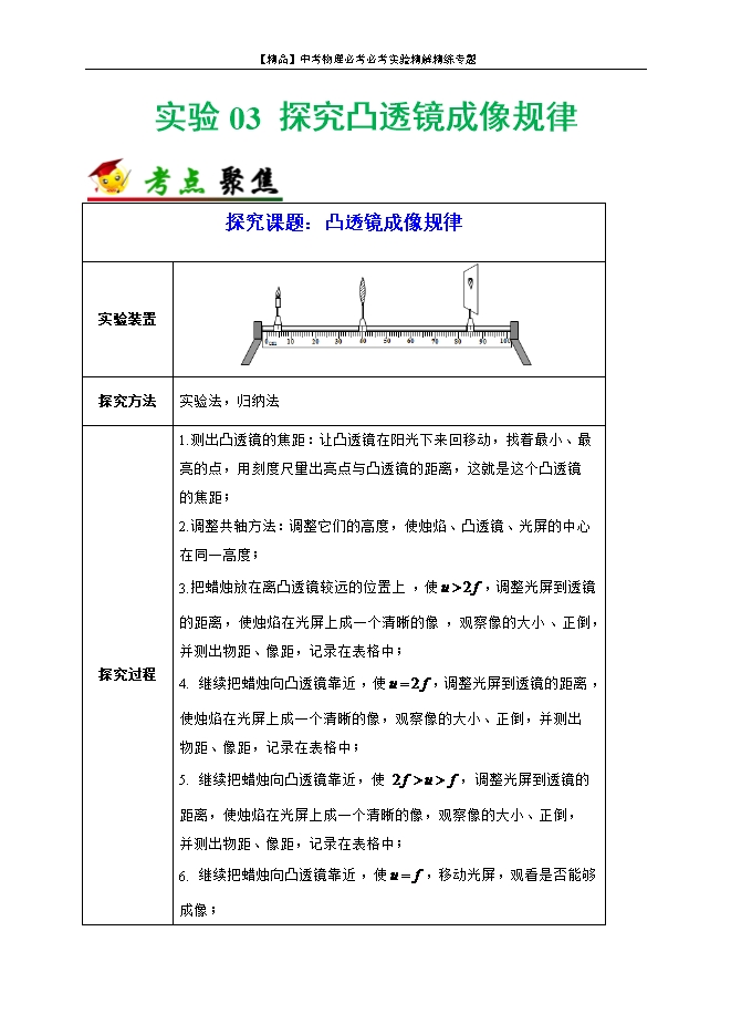 【内容简介】探究课题:凸透镜成像规律实验装置 探究方法实验法,归纳法探究过程1.测出凸透镜的焦距:让凸透镜在阳光下来回移动,找着最小、最亮的点,用刻度尺量出亮点与凸透镜的距离,这就是这个凸透镜的焦距;2.调整共轴方法:调整它们的高度,使烛焰、凸透镜、光屏的中心在同一高度;3.把蜡烛放在离凸透镜较远的位置上,使 ,调整光屏到透镜的距离,使烛焰在光屏上成一个清晰的像,观察像的大小、正倒,并测出物距、像距,记录在表格中;4. 继续把蜡烛向凸透镜靠近,使 ,调整光屏到透镜的距离,使烛焰在光屏上成一个清晰的像,观察像的大小、正倒,并测出物距、像距,记录在表格中;5. 继续把蜡烛向凸透镜靠近,使 ,调整光屏到透镜的距离,使烛焰在光屏上成一个清晰的像,观察像的大小、正倒,并测出物距、像距,记录在表格中;6. 继续把蜡烛向凸透镜靠近,使 ,移动光屏,观看是否能够成像;7. 继续把蜡烛向凸透镜靠近,使 ,移动光屏,观看是否能够成像,并寻找像的位置和虚实;实验结论物距(u)像距(v)正倒大小虚实应用特点物,像的位置关系u>2f2f>v>f倒立缩小实像照相机、摄像机-物像异侧u=2fv=2f倒立等大实像精确测焦仪成像大小的分界点物像异侧2f>u>fv>2f倒立放大实像幻灯机、电影、投影仪-物像异侧u=f---不成像强光聚焦手电筒成像虚实的分界点-f>uv>u正立放大虚像放大镜虚像在物体同侧虚像在物体之后物像同侧满分归纳——考点方向注意事项1.调整蜡烛、凸透镜、光屏的中心在同一高度,目的是:让像成在光屏的中央;2.光屏上找不到像的其他原因:①物距小于或等于一倍焦距;②物距太小,像距太大,超过了光具座的量程。③三者中心未在同一高度。3.用纸板遮住透镜部分后能否在光屏上看到蜡烛的像:能看到一个完整的像,只是变暗;4.蜡烛燃烧变短,像在光屏上的位置向上移动,调节像在光屏中央的方法:①将光屏向上调节;②将蜡烛向上调节;③将凸透镜向下调节;5.光屏上成清晰的像时,对调物与光屏的位置,光屏上还能成清晰的像,这说明:光路可逆;6.在凸透镜前加近视眼镜片,要在光屏上找到清晰的像,如何移动光屏:光屏远离透镜;7.换成较厚的凸透镜,要在光屏上找到清晰的像,如何移动光屏:光屏靠近透镜;