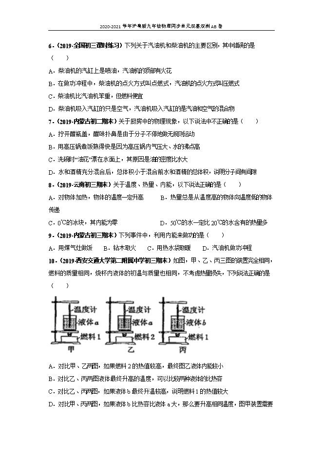 【内容简介】1.(2019•江阴市第一初级中学初三期中)下列有关热的说法正确的是( )A.晶体在熔化过程中温度不变,内能也不变B.某台四冲程汽油机的飞轮转速为2 400 r/min,则1 s内该汽油机对外做功80次C.在沿海,由于陆地和大海升、降温快慢不同,所以白天的风通常从大海吹向陆地D.热机所用燃料的化学能转化成的内能越多,该热机的效率越高【答案】C【解析】A.晶体在熔化过程中,虽然温度保持不变,但是在不断吸热,所以内能增大,故A错误;B.四冲程汽油机的飞轮转速若为2400r/min,则该飞轮每秒钟转40圈;由于一个工作循环飞轮转2圈,完成四个工作冲程,做功1次,活塞往复2次,所以1s内,飞轮转40圈,活塞往复运动80次,共20个工作循环,80个冲程,做功20次,故B错误;C.白天,在太阳照射下陆地和海水吸收相同的热量,由于水的比热容比泥土、沙石的比热容大,所以,海水吸热后温度上升慢;陆地吸热后,温度上升快,热空气上升,风从海洋吹向陆地,形成海风,故C正确;D.热机效率是指热机用来做有用功的能量与燃料完全燃烧放出能量的比值,故D错误。2.(2019•山东初三期中)关于热量、内能和温度,下列说法中正确的是( )A.温度高的物体内能一定大 B.温度高的物体含有的热量多C.物体内能增加,不一定要从外界吸收热量 D.温度是内能改变的量度【答案】C【解析】A.内能的多少与物体的质量、温度、状态有关,单比较物体的温度不能判断内能的大小,故A错误;B.热量是一个过程量,要用“吸收”或“放出”来表达,而不能用“具有”或“含有”来修饰,故B错误;C.改变物体内能的方式是做功和热传递,物体内能增加,不一定要从外界吸收热量,也可以是外界对其做了功,故C正确。D.温度是表示物体冷热程度的物理量,物体内能改变,温度不一定改变,故D错误。3.(2019•江苏初二期中)下列现象中,不能用分子动理论解释的是( )A.海绵很容易被压缩 B.湿衣服在阳光下逐渐晒干C.春天,校园里花香扑鼻 D.将两个表面光滑的铅块相互紧压后会粘在一起【答案】A【解析】A.海绵中存在很多的小孔,当我们挤压时会很容易,这种现象不能用分子动理论解释;B.湿衣服在阳光下,衣服中的水分子不断运动,蒸发到空气中,衣服就变干,这是水分子运动的结果,能用分子运动理论解释;C.春天校园里的花开以后,花里面的芳香分子不断扩散到空气中,所以花香扑鼻,是分子运动的结果,能用分子动理论解释。D.分子间有相互作用的引力和斥力,两个表面光滑的铅块相互挤压后粘在一起,是因为分子间由引力,能用分子运动理论解释;4.(2019•江苏初三期中)如图所示,在金属管内装一些酒精,当迅速来回拉动绕过金属管的粗绳时,筒壁会发热,一会儿,看到紧塞在管口的塞子突然被射出,同时听到“呯”的一声.根据这些现象,下列说法不正确的是( ) A.来回拉动粗绳时,将机械能转化为内能 B.塞子被射出,将内能转化为机械能C.筒壁会发热,原因是酒精的化学能转化为内能 D.筒壁会发热,原因是克服摩擦做功,物体内能增加【答案】C【解析】A、拉动绳子时,绳子与筒壁相互摩擦做功,机械能转化为它们的内能,故A正确,不符合题意;B、筒内气体膨胀对活塞做功,内能转化为机械能,故B正确,不符合题意;CD、拉动绳子时,绳子与筒壁相互摩擦做功,机械能转化为筒壁的内能,使其内能增大,温度升高,故C错误,符合题意,D正确,不符合题意。故选C。5.(2019•江苏初三期中)关于内能、温度和热量,下列说法正确的是( )A.物体的内能跟物体的运动速度、物体的温度和物质状态都有关系B.物体沿光滑的斜面滑下时,温度升高,内能增大C.质量和初温相同的水和煤油,放出相同热量时煤油温度降低的多D.内能总是从内能多的物体向内能少的物体转移【答案】C【解析】A、物体的内能与物体的运动速度无关,故A错误;B、物体沿光滑斜面下滑时,机械能守恒,没有内能产生,内能不变,故B错误;C、质量相同、初温相同的水和煤油,放出相同的热量;因为水的比热容大,所以水的温度变化小,煤油的温度变化大,故煤油的末温低一些,故C正确;D、根据热传递的定义可知,内能总是从温度高的物体向温度低的物体转移,故D错误。6.(2019•全国初三课时练习)下列关于汽油机和柴油机的主要区别,其中错误的是( )A.柴油机的汽缸上是喷油,汽油机的顶部有火花B.在做功冲程中,柴油机的点火方式叫点燃式,汽油机的点火方式叫压燃式C.柴油机比汽油机笨重,但燃料便宜D.柴油机吸入汽缸的只是空气,汽油机吸入汽缸的是汽油和空气的混合物【答案】B【解析】A. 柴油机和汽油机在结构上的不同是:柴油机的气缸上是喷油嘴,汽油机的顶部有火花塞,故A正确;B. 在做功冲程中,柴油机的点火方式叫压燃式,汽油机的点火方式叫点燃式,故B错误;C. 柴油机比汽油机笨重,但燃料便宜,功率大,多用在拖拉机,坦克等笨重的机械上,故C正确;D. 柴油机和汽油机在吸气冲程中吸入汽缸的物质不同:柴油机吸入气缸的只是空气,汽油机吸入气缸的是汽油和空气的混合物,故D正确;