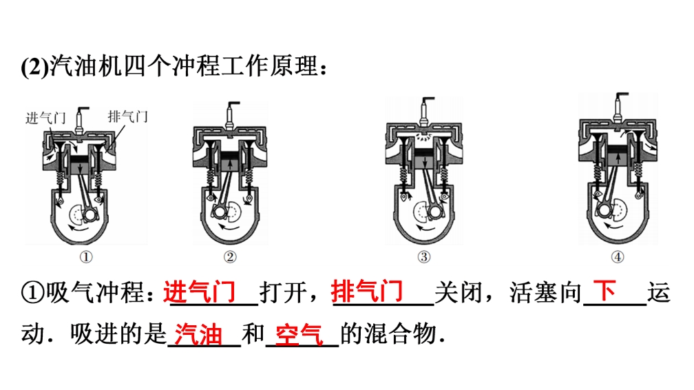 【内容简介】一、热机1.定义:是把 转化为 的机器. 2.种类:如:蒸汽机、 、 汽轮机、喷气机等; 是最常见的热机.二、内燃机1.定义:燃料直接在发动机 内燃烧产生动力的热机,叫做内燃机.2.工作原理:燃料在汽缸内燃烧,产生高温高压的燃气,把 能转化为 能;然后燃气推动活塞做功,把 能转化为 能.3.分类:内燃机分为 和 两大类,它们分别用 和 作为燃料.4.内燃机的四个冲程的特点(1)冲程定义:活塞在汽缸内往复运动时,从汽缸的一端运动到 的过程.四个冲程: 、 、 、 .一个工作循环,曲轴和飞轮转动 周,活塞往复运动 次,对外做功 次.