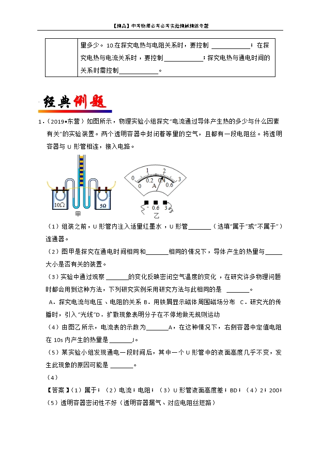 【内容简介】探究课题:电流产生的热量与电阻的关系实验装置 实验方法控制变量法,转换法实验原理根据煤油在玻璃管里(温度计示数变化)上升的高度来判断电流通过电阻丝通电产生电热的多少探究过程1.按电路图连接实物图,使两个U形管中液柱的高度是否相平,滑动变阻器滑片P移到阻值最大端;2.检查无误后,闭合开关,调节滑动变阻器,读出此时电流的大小;3.观察两U形管中液柱高度的变化,把实验数据填入表中;记录表格电流I/A电阻/Ω R1R2 产生热量(多/少) 实验结论在电流相同、通电时间相同的情况下,电阻越大,这个电阻产生的热量越多探究课题:电流产生的热量与电流大小的关系实验装置 探究过程1.按电路图连接实物图,使两个U形管中液柱的高度是否相平,滑动变阻器滑片P移到阻值最大端;2.检查无误后,闭合开关,调节滑动变阻器,此时电流表的示数等于电阻R1中电流大小,电阻R2中的电流等于电流表读数的一半;3.观察两U形管中液柱高度的变化,把实验数据填入表中;记录表格电阻R/Ω电阻R/Ω I1I2 产生热量(多/少) 实验结论在电阻相同、通电时间相同的情况下,通过一个电阻的电流越大,这个电阻产生的热量越多满分归纳——考点方向器材作用1.滑动变阻器的作用:①保护电路;②改变电路中的电流注意事项1.连接实验电路时,开关应断开;电流表应串联在被测电路中,连接好电路后,要先用开关试触。2.如果发现电表的指针向左边偏转,说明电表的正负按线柱接反了。3.闭合开关前,发现其中一个电表指针没有指在零刻度上,出现这种现象的原因是 没调零 。4.闭合开关后,发现电表的指针偏转太大,或太小,那一定是电表的量程选择不合适。5.电表的量程选择得过小,会使指针偏转过大,损坏电表;选择得过大,会使指针偏转过小,测量不准确。一般来说,选择的量程,应使指针偏转到刻度盘的三分之一到三分之二之间。6.实验采用煤油的目的:煤油比热容小,在相同条件下吸热温度升高的快。7.滑动变阻器应采用一上一下的连接方法。8.选用加热材料的要求:质量、初温、材料相同。9.本实验是利用空气的热胀冷缩的性质来反映电流通过电阻产生热量的多少,现象比较明显,测量方便。实验中也可以利用电阻丝加热液体(如煤油等),通过液体温度上升的数值来比较放出热量多少。10.在探究电热与电阻关系时,要控制电流相同;在探究电热与电流关系时,要控制电阻一定;探究电热与通电时间的关系时需控制电阻和电流相同。