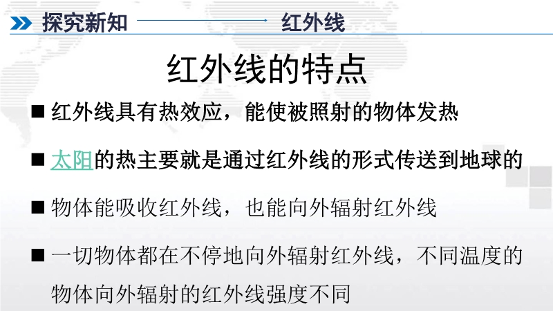 【内容简介】哪种光的发热本领大?1800年英国物理学家赫歇尔在研究各种色光的热效应时发现了下个奇怪的现象:当温度计放在色散光带红光的外侧时,其示数也会增大。让太阳光透过三棱镜重做色散实验,把温度计玻璃泡分别放在红光以外、可见光区、紫光以外各不同位置,观察温度计的示数变化情况。温度计放在红光外侧时,温度会上升。红光外侧存在着一种不可见光——红外线。红外线能使被照射的物体发热,具有热效应。可见光与不可见光人眼能感觉到特定频率范围内的光,即人眼能看到的光,称为可见光人眼无法看见的光称为不可见光光谱中红光外侧的不可见光叫做红外线.
