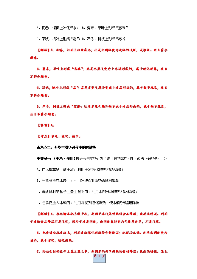 【内容简介】一、升华1.升华:物质从固态直接变成气态的过程叫升华。2.升华时能量的传递:物质升华时要吸热。如:①干冰可用来冷藏物品(干冰是固态二氧化碳,升华成气态时,吸收大量的热)。3.常见升华现象:① 加热碘,可以看到有紫红色的碘蒸气出现。② 衣柜中防虫用的樟脑片,会慢慢变小,最后不见了。③ 冬天,湿衣服放在户外会结冰,但最后也会晾干(冰升华成水蒸气)。④ 白炽灯用久了,灯内的钨丝比新的细(钨丝升华成钨蒸气,体积减小)。⑤ 用干冰制舞台上的雾、用干冰制雨。二、凝华1.凝华:物质从气态直接变成固态的过程叫凝华。2.凝华时能量的传递:物质凝华时要放热。3.常见凝华现象:①霜和雪的形成(水蒸气遇冷凝华而成);②冬天看到树上的“雾凇”;③冬天,外界温度极低,窗户内侧可看见“冰花”(室内水蒸气凝华)。 1.升华和凝华物态变化包括熔化与凝固、汽化与液化、升华与凝华,物态变化在中考试卷中占据一定的比例,是中考物理试卷中的必考题;当然,升华好凝华与其他物态变化一样属于常考内容。升华和凝华应重点注意以下几方面问题:一、干冰的利用、樟脑片的利用、灯管和灯泡发黑现象等均是升华现象;二、霜、雪、雾凇、冬天窗花的形成均是凝华现象;三、升华需要吸热,凝华需要放热。物态变化和生产、生活密切相关,地球上大量能源来自太阳,春、夏、秋、冬四季的变化就是物态变化的体现。人类的衣、食、住、行都与物态变化有着密不可分的关系。所以要特别注重将所学知识用于分析解决简单的实际问题。2.考点分类:考点分类见下表考点分类考点内容考点分析与常见题型常考热点升华与凝华的判断、吸放热选择题或填空题较多一般考点用升华、凝华解释自然现象简单题、填空题较多,用规律解释现象冷门考点升华、凝华的探究实验通过实验探究了解升华、凝华的规律,出现概率较低 ★考点一:升华与凝华◆典例一:(中考•广元)小丽端午节在家里帮助妈妈打扫卫生,她取下白炽灯擦干净灰尘,但发现白炽灯玻璃泡的下面比新灯泡黑了一些。她通过上网查阅,发现这是灯丝物态变化形成的。你认为下列关于灯丝发生物态变化过程的四个说法,正确的是( )。A.先升华,后凝华;B.先升华,后凝固;C.先汽化,后液化;D.先溶化,后凝固【解析】灯丝在高温下直接升华为气态,气态的钨遇温度低的灯泡壁后凝华.所以灯泡变黑,故应选A。【答案】A。【考点】升华、凝华。◆典例二:(中考•威海)下列关于物态变化的实例中属于熔化的是( )。