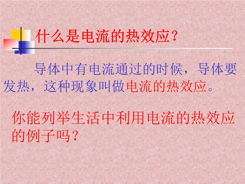 【内容简介】灯泡接入电路中时,灯泡和电线中流过相同的电流,灯泡和电线都要发热,可是实际上灯泡热得发光,电线的发热却觉察不出来。这是为什么?假如在照明电路中接入大功率的电炉,电线将显著发热,有可能烧坏它的绝缘皮,甚至引起火灾。这又是为什么?导体中有电流通过的时候,导体要发热,这种现象叫做电流的热效应。结论1. 在通电电流和通电时间相同的条件下,电阻越大,电流产生的热量越多。结论2. 在电阻和通电时间相同的条件下,电流越大,电流产生的热量越多。 结论3. 在通电电流和电阻相同的条件下,通电时间越长,电流产生的热量越多。内容:电流通过导体产生的热量跟电流的二次方成正比,跟导体的电阻成正比,跟通电时间成正比。