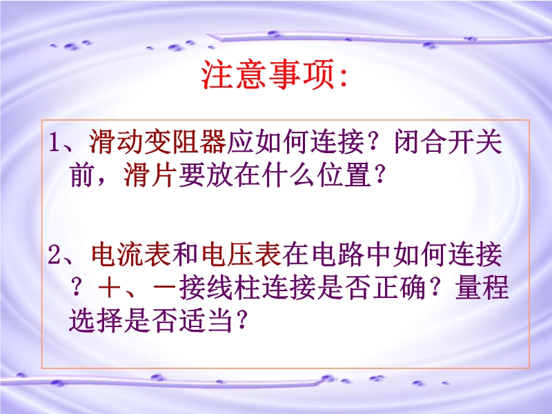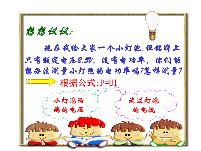 【内容简介】想议议: 现在我给大家一个小灯泡,但铭牌上只有额定电压2.5V,没有电功率,你们能想办法测量小灯泡的电功率吗?怎样测量?1、滑动变阻器应如何连接?闭合开关前,滑片要放在什么位置?2、电流表和电压表在电路中如何连接?+、-接线柱连接是否正确?量程选择是否适当?3、 注意观察小灯泡在什么情况下正常发光,在什么情况下小灯泡比正常情况更亮,什么情况下小灯泡比正常情况下暗。需小心调节滑动变阻器,以免因实际电压超过额定电压太多,导致电压过大而烧毁灯泡。