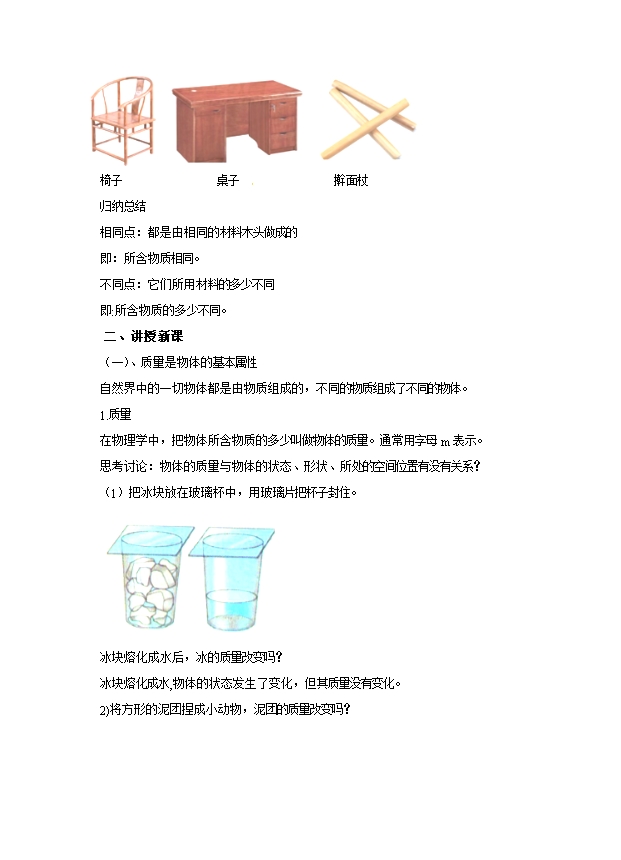 【内容简介】一、导入新课观察下面的图片思考它们有什么相同点和不同点: 椅子 桌子 擀面杖归纳总结相同点:都是由相同的材料木头做成的即:所含物质相同。 不同点:它们所用材料的多少不同即:所含物质的多少不同。二、讲授新课(一)、质量是物体的基本属性[来源:学。科。网]自然界中的一切物体都是由物质组成的,不同的物质组成了不同的物体。1.质量在物理学中,把物体所含物质的多少叫做物体的质量。通常用字母m表示。思考讨论:物体的质量与物体的状态、形状、所处的空间位置有没有关系?(1)把冰块放在玻璃杯中,用玻璃片把杯子封住。 冰块熔化成水后,冰的质量改变吗?冰块熔化成水,物体的状态发生了变化,但其质量没有变化。2)将方形的泥团捏成小动物,泥团的质量改变吗?