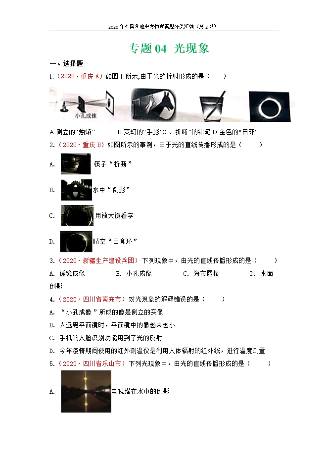 【内容简介】一、选择题1.(2020•重庆A)如图1所示,由于光的折射形成的是( ) A.倒立的“烛焰” B.变幻的“手影”C、.折断”的铅笔D金色的"日环”答案:C解析:A选项,小孔成像利用的是光焰直线传播,A错误;B选项,手影利用的是光的直线传播,B错误;C选项,“折断的铅笔”是利用的光的折射,C正确;D选项,日食利用的是光焰直线传播,D错误。2.(2020•重庆B)如图所示的事例,由于光的直线传播形成的是( )A. 筷子“折断”B. 水中“倒影”C. 用放大镜看字D. 晴空“日食环”【答案】D【解析】【详解】A.放在水中的筷子看起来向上弯折,是因为光从水中斜射入空气时,折射角大于入射角,属于光的折射现象,故A不符合题意;B.倒影属于平面镜成像,是由于光的反射形成的,故B不符合题意;C.放大镜把文字放大是凸透镜成像,属于光 折射原理,故C不符合题意;D.在同一均匀介质中光是沿直线传播的,当太阳、地球、月亮三者处在同一直线时,月亮挡住了太阳光从而形成了日食环,故D符合题意。故选D。3.(2020•新疆生产建设兵团)下列现象中,由光的直线传播形成的是( )A. 透镜成像B. 小孔成像C. 海市蜃楼D. 水面倒影【答案】B【解析】【详解】A.凹透镜和凸透镜都是利用光的折射的原理成像,故A不符合题意;B.小孔成像的原理,是利用光在同种均匀介质中沿直线传播,即光的直线传播,故B符合题意;C.海市蜃楼是一种因为光的折射和全反射而形成的自然现象,是地球上物体反射的光经大气折射而形成的虚像,故C不符合题意;D.水中倒影的原理是光的反射,故D不符合题意。故选B。4.(2020•四川省南充市)对光现象的解释错误的是( )A. “小孔成像”所成的像是倒立的实像B. 人远离平面镜时,平面镜中的像越来越小C. 手机的人脸识别功能用到了光的反射D. 今年疫情期间使用的红外测温仪是利用人体辐射的红外线,进行温度测量【答案】B【解析】【详解】A.小孔成像成的像是倒立的实像,可以是放大的、缩小的、也可以是等大的,故A正确,不符合题意;B.平面镜成的像与物体大小相等,人远离平面镜时,人的大小不变,像的大小不变,故B错误,符合题意;C.手机的人脸识别,是人脸反射的光进入手机摄像头,手机进行识别,故C正确,不符合题意;D.红外测温仪能检测到的人体辐射的红外线,然后转换成电信号,显示温度,故D正确,不符合题意。故选B。