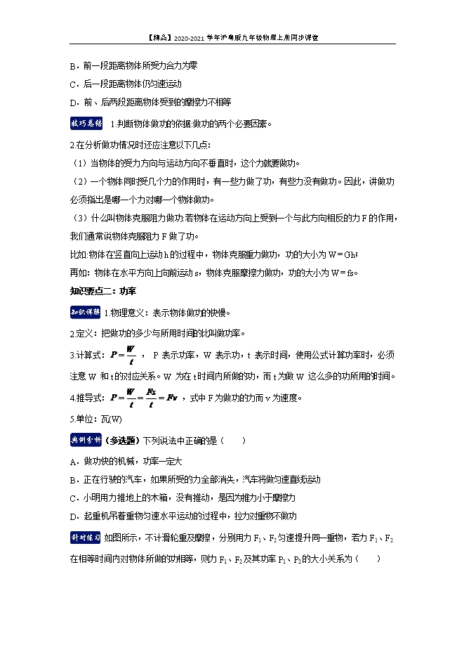 【内容简介】知识要点一:功 1.做功的两个必要因素:(1)作用在物体上的力;(2)物体在力的方向上通过的距离。2.不做功的三种情况(1)物体受力,但物体没有在力的方向上通过距离。此情况叫“劳而无功”。(2)物体移动了一段距离,但在此运动方向上没有受到力的作用(如物体因惯性而运动)。此情况叫“不劳无功”。(3)物体既受到力,又通过一段距离,但两者方向互相垂直(如起重机吊起货物在空中沿水平方向移动)。此情况叫“垂直无功”。3.功的计算:(1)公式:一般式 W=Fs ;常用式 W=Gh(克服重力做功)或W=f阻s(克服摩擦阻力做功)。(2)单位:焦耳(J)4.注意事项:(1)F与s的方向应在同一直线上(初中要求)(比如一个人提着一重物G,从山脚顺着“之”字形的山路爬到山顶,此时人克服重力做功所移动的距离并不是山路的长,而是从山脚到山顶的高)(2)做功的多少,由W=Fs决定,而与物体的运动形式无关。 下列说法中正确的是( )A.用手从地面竖直提起水桶,手竖直向上的拉力对水桶做了功B.提着水桶在路面上水平向前移动一段路程,手竖直向上的拉力对水桶做了功C.抛出手的铅球在空中向前运动的过程中,推力对铅球做了功D.用力推一辆汽车,汽车静止不动,推力在这个过程中对汽车做了功【答案】A【解析】A.用手从地面向上提起水桶,在拉力的方向上移动了距离,根据做功的两个必要因素判断拉力做了功,故A正确;B.提着水桶水平前进时,在水平方向移动了距离,而手的拉力沿竖直方向,所以拉力不做功,故B错误;C.抛出去的铅球由于惯性在空中飞行,球离开手以后推力已消失,故推力没有做功,故C错误;D.用力推汽车,没有推动,没有在力的方向上移动距离,推力没有做功,故D错误。故选A。 物体在水平面上做直线运动,先在大小为F的水平推力作用下匀速前进了一段距离,接着在方向不变大小为2F的推力作用下继续前进了相同距离,下列说法正确的是( )A.整个过程重力对物体做了功B.前一段距离物体所受力合力为零C.后一段距离物体仍匀速运动D.前、后两段距离物体受到的摩擦力不相等【答案】B【解析】A.重力的方向竖直向下,物体位移在水平方向,重力做功为零,故A错误;B.物体在前一段是处于匀速直线运动状态,所以前一段距离物体所受力合力为零,故B正确;C.物体前一段在大小为F的水平推力作用下匀速前进,水平方向上受力平衡,摩擦阻力f等于推力F;后一段在方向不变大小为2F的推力作用下时,推力大于摩擦阻力,物体做加速运动,故C错误;D.由于物体对水平面的压力不变,接触面的粗糙程度不变,所以物体受到的摩擦力不变,故D错误。故选B。