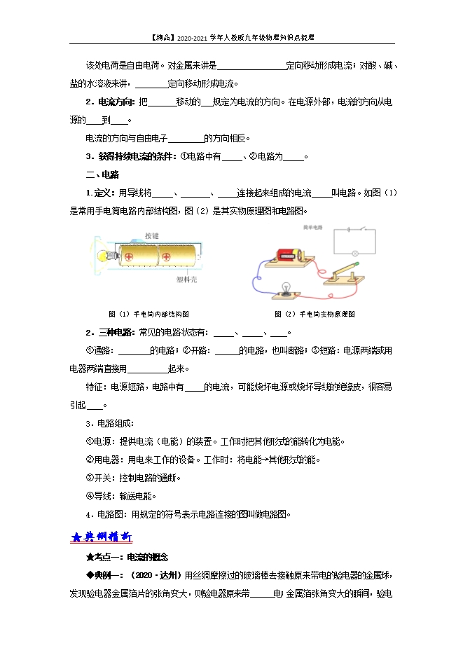 【内容简介】二、考点解析1.本节内容是电磁学的基础。主要是认识电路、学习电路的最基本、最基础的内容,也是学生接触电路理论的开始,故其重要性不言而喻。本节主要讲述了电流的概念(电流的形成、电流的方向)、电路的概念(电路的构成、电路图和电路的三态)。2.纵观各地中考考纲和近三年考卷来看,对本节知识点的考查主要集中在对电流概念的理解、电路的组成和对电路连接方式的判断三个方面,属于基础题;但作为基础内容,在中考中,只考本节知识点的题目不会太多,出现的概率也不高,一般情况下本节知识点与其他相关知识点结合的考题更多些。考试题型多为选择题。3.考点分类:考点分类见下表考点分类考点内容考点分析与常见题型常考热点电流的形成与电流方向选择题、填空题,考查对电流概念的理解电路的连接或判断选择题,考查学生对电路连接的理解一般考点电路的三态选择题,考查学生对电路三态的认识★知识点精析一、电流1.形成:电荷的定向移动形成电流。该处电荷是自由电荷。对金属来讲是自由电子定向移动形成电流;对酸、碱、盐的水溶液来讲,正负离子定向移动形成电流。2.电流方向:把正电荷移动的方向规定为电流的方向。在电源外部,电流的方向从电源的正极到负极。电流的方向与自由电子定向移动的方向相反。3.获得持续电流的条件:①电路中有电源、②电路为通路。二、电路1.定义:用导线将电源、用电器、开关连接起来组成的电流路径叫电路。如图(1)是常用手电筒电路内部结构图,图(2)是其实物原理图和电路图。 图(1)手电筒内部结构图图(2)手电筒实物原理图2.三种电路:常见的电路状态有:通路、开路、短路。①通路:接通的电路;②开路:断开的电路,也叫断路;③短路:电源两端或用电器两端直接用导线连接起来。特征:电源短路,电路中有很大的电流,可能烧坏电源或烧坏导线的绝缘皮,很容易引起火灾。3.电路组成:①电源:提供电流(电能)的装置。工作时把其他形式的能转化为电能。②用电器:用电来工作的设备。工作时:将电能→其他形式的能。③开关:控制电路的通断。④导线:输送电能。4.电路图:用规定的符号表示电路连接的图叫做电路图。★典例精析★考点一:电流的概念◆典例一:(2020•达州)用丝绸摩擦过的玻璃棒去接触原来带电的验电器的金属球,发现验电器金属箔片的张角变大,则验电器原来带______电;金属箔张角变大的瞬间,验电器金属杆里的电流方向是______(选填“从金属箔片到金属球”或“从金属球到金属箔片”)。【答案】(1)正;(2)从金属到金属箔片。【解析】我们知道用丝绸摩擦过的玻璃棒,玻璃棒带正电,玻璃棒去接触原来带电的验电器的金属球,发现验电器金属箔片的张角变大,说明验电器原来带正电。金属箔张角变大,说明玻璃棒带的正电荷大于验电器所带的正电荷,正电荷移动的方向是从金属到金属箔片,我们规定正电荷移动的方向就是电流的方向,所以,金属箔张角变大的瞬间,验电器金属杆里的电流方向是从金属到金属箔片。◆典例二:(2020•四川遂宁)生产生活中我们经常用到汽油,汽油易挥发,易燃易爆,运输中汽油与油罐摩擦产生静电,油罐失去电子带上 电荷,电荷累积到一定程度极易出现放电观象,引起汽油燃烧爆炸,为防止爆炸事故发生,油罐车通常都在车架加装铁链与大地接触以中和油罐所带电荷,该过程铁链中自由电子定向移动方向是从 (选填“大地到油罐”或“油罐到大地”)。【答案】正;大地到油罐。【解析】运输中汽油与油罐摩擦产生静电,油罐失去电子带上正电荷;油罐带多余的正电荷,当铁链与大地接触时,会产生从油罐到大地的电流;铁链中带负电荷的自由电子定向移动的方向与电流方向相反,会从大地到油罐发生定向移动,和油罐中多余的正电荷发生中和,避免发生放电现象。故答案为:正;大地到油罐。★考点二:电路的概念◆典例一:(2018•青岛)设计一个病床呼叫电路。要求:开关S1控制指示灯L1和电铃;开关S2控制指示灯L2和电铃。请在图中连线,形成符合要求的完整电路图。
