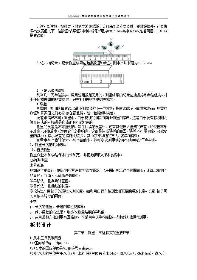 2020-2021学年教科版八年级物理上册教学设计:1.2测量:实验探究的重要环节