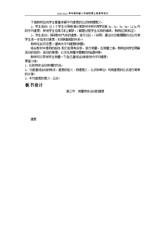 2020-2021学年教科版八年级物理上册教学设计:2.3测量物体的运动速度