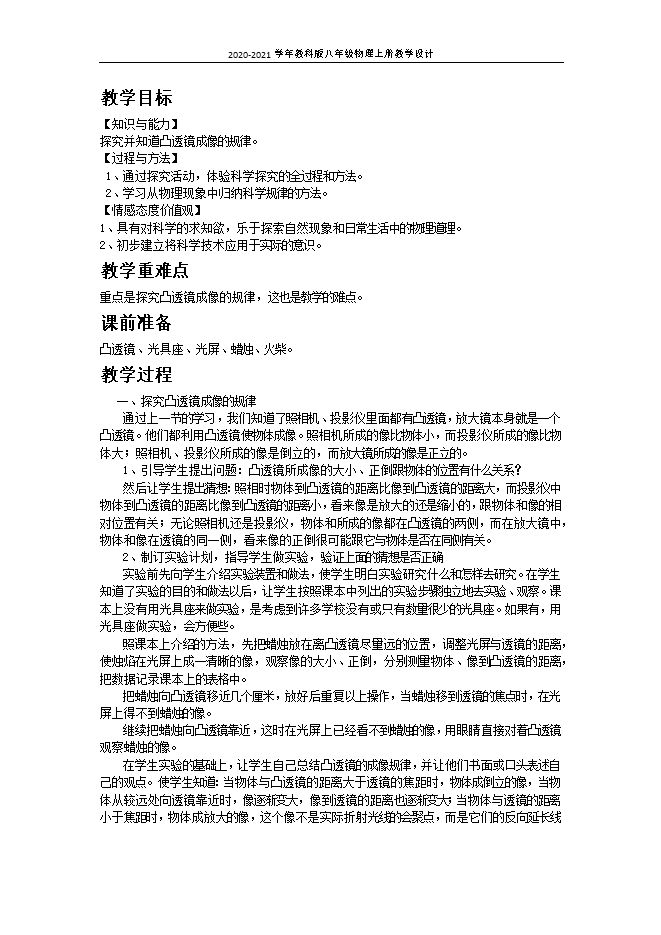 2020-2021学年教科版八年级物理上册教学设计:4.5科学探究:凸透镜成像(两课时)