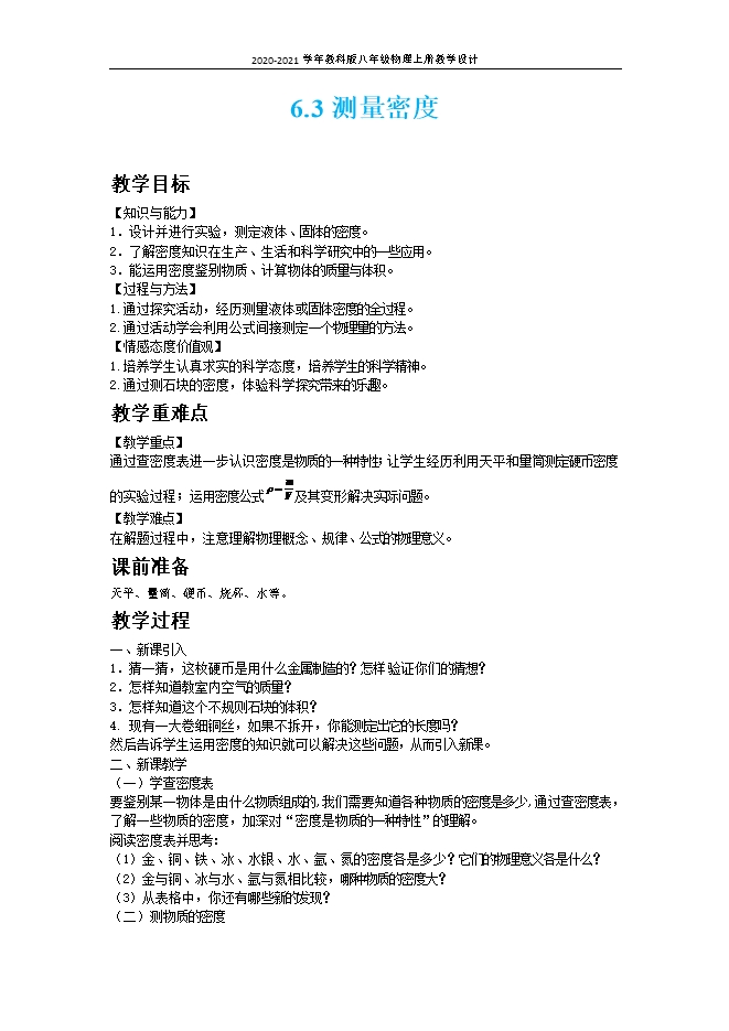 2020-2021学年教科版八年级物理上册教学设计:6.3测量密度