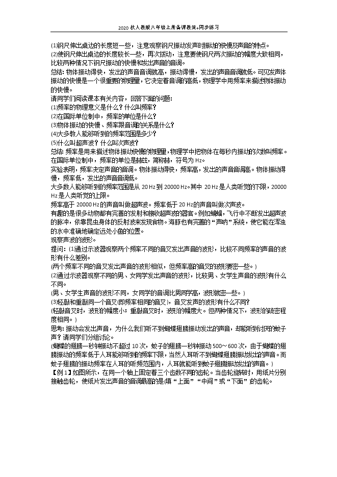 2020秋人教版八年级上册备课教案+同步练习:2.2声音的特性(附答案)