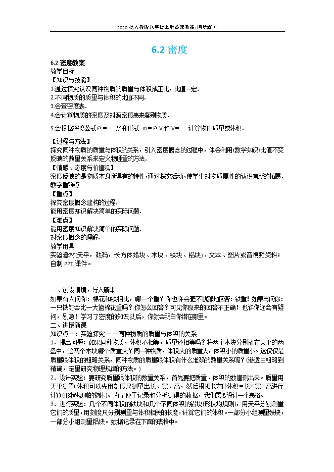 2020秋人教版八年级上册备课教案+同步练习:6.2密度(附答案)
