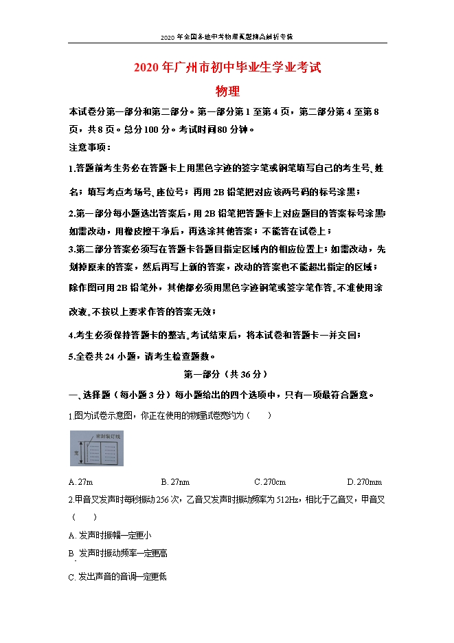 2020年全国各地中考物理真题精品解析专辑:广东广州卷(word解析版和原卷版)