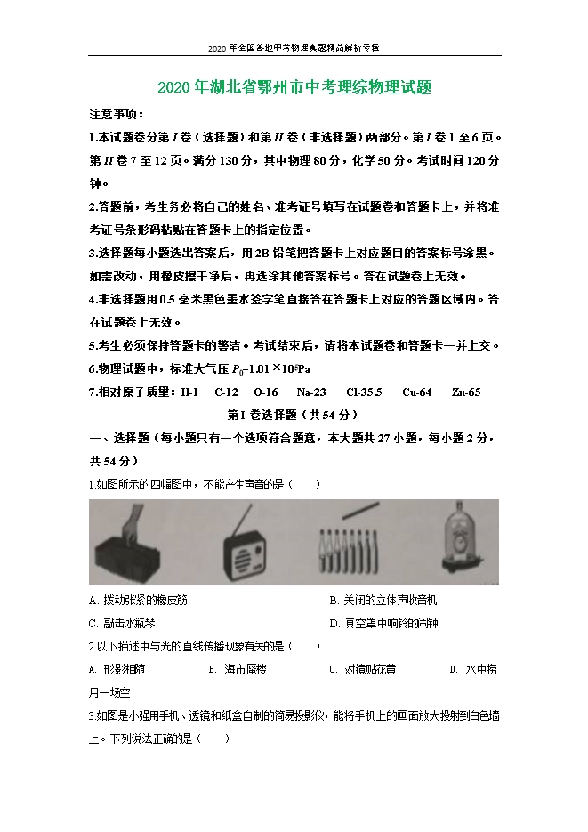 【内容简介】注意事项:1.本试题卷分第I卷(选择题)和第II卷(非选择题)两部分。第I卷1至6页。第II卷7至12页。满分130分,其中物理80分,化学50分。考试时间120分钟。2.答题前,考生务必将自己的姓名、准考证号填写在试题卷和答题卡上,并将准考证号条形码粘贴在答题卡上的指定位置。3.选择题每小题选出答案后,用2B铅笔把答题卡上对应题目的答案标号涂黑。如需改动,用橡皮擦干净后,再选涂其他答案标号。答在试题卷上无效。4.非选择题用0.5毫米黑色墨水签字笔直接答在答题卡上对应的答题区域内。答在试题卷上无效。5.考生必须保持答题卡的警洁。考试结束后,请将本试题卷和答题卡一并上交。6.物理试题中,标准大气压P0=1.01×105Pa7.相对原子质量:H-1 C-12 O-16 Na-23 Cl-35.5 Cu-64 Zn-65第I卷选择题(共54分)一、选择题(每小题只有一个选项符合题意,本大题共27小题,每小题2分,共54分)1.如图所示的四幅图中,不能产生声音的是( ) A. 拨动张紧的橡皮筋B. 关闭的立体声收音机C. 敲击水瓶琴D. 真空罩中响铃 闹钟【答案】B【解析】【详解】A.拨动张紧的橡皮筋,橡皮筋振动,可以产生声音,故A不符合题意;B.关闭的立体声收音机,没有产生振动,不能产生声音,故B符合题意; C.敲击水瓶琴,水瓶琴振动发声,故C不符合题意;D.响铃的闹钟能产生声音,但真空不能传声,所以没听到声音,故D不符合题意。故选B。2.以下描述中与光的直线传播现象有关的是( )A. 形影相随B. 海市蜃楼C. 对镜贴花黄D. 水中捞月一场空【答案】A【解析】【详解】形影相随指影子随着物体移动,是光的直线传播;海市蜃楼是由于光的折射现象;对镜贴花黄指人对着镜子梳妆打扮,水中捞月是平面镜成像,均是光的反射现象,A符合题意,BCD不符合题意。故选A。3.如图是小强用手机、透镜和纸盒自制的简易投影仪,能将手机上的画面放大投射到白色墙上。下列说法正确的是( ) A. 手机屏幕到透镜的距离应大于透镜的二信焦距B. 白色墙上呈现的是手机画面倒立、放大的实像C. 若用不透明的硬纸板遮住透镜的一部分,白色墙上的画面将不再完整D. 从各个角度都能清楚地看到白色墙上的像,是因为墙对光发生了镜面反射【答案】B【解析】【详解】A.根据投影仪成像的原理可知,手机到透镜的距离应大于焦距,小于二倍焦距,故A错误;B.投影仪成的像是倒立、放大的实像,故B正确;C.若用不透明的硬纸板遮住透镜的一部分,白墙上的画面仍然完整,只是亮度变暗,故C错误;D.发生漫反射的物体可以从不同角度都能看到,因此从各个角度都能清楚的看到白墙上的像,是因为白墙对照射到其上面的光产生漫反射,故D错误。故选B。4.下列物态变化中,属于液化现象的是( )A. 湿衣服晾干B. 冰棒周围冒白气C. 冰雪消融D. 用久的灯泡内壁发黑【答案】B【解析】【详解】A.湿衣服晾干是水汽化成了水蒸气,故A错误;B.冰棒周围冒白气是冰棒周围的空气中的水蒸气遇冷液化成小水珠,故B正确;C.冰雪消融是熔化现象,故C错误;D.灯泡内壁发黑是灯的钨丝先升华再凝华造成的,故D错误。故选B。