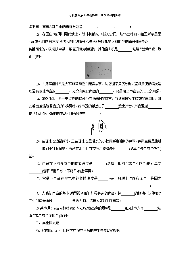 【内容简介】1.以下实验不能阐述声音产生条件的是( )A.将正在发声的音叉放入水中,音叉能激起水花B.将纸屑放在发声的喇叭上,看到纸屑在“跳舞”C.将正在发声的音叉去接近悬挂的小球,小球被弹开D.将正在发声的闹钟放入密闭的玻璃罩内,抽掉里面的空气,发现声音越来越小,直至几乎听不见2.嘹亮的军号声是由以下哪个物体振动发出声音的( )A.军号 B.钢管C.军号内的空气 D.人嘴3.将拨响的琴弦用手一按,响声立即停止,原因是 ( )A.声音被手挡住了 B.声音被手吸收了 C.琴弦的振动变慢了 D.琴弦的振动停止了4.下列能够说明液体可以传播声音的生活现象是( )A.岸上的行人听到河水的哗哗声B.海边的人听到海浪拍打礁石的声音C.水中的潜水员能听到岸上人的讲话声D.枕着牛皮箭筒睡在地上能听到马蹄声5.如图所示,把正在响铃的闹钟放在玻璃罩内,闹钟和罩的底座之间垫上柔软的泡沫塑料,逐渐抽出罩内的空气,闹钟的声音会逐渐变小,直至听不到声音;再让空气逐渐进入玻璃罩,闹钟的声音会逐渐变大。这个实验表明了( ) A.声音是由物体振动产生的B.声音只在玻璃罩内传播C.声音必须通过介质才能传播D.声波在传播过程中能量逐渐减少6.声音在不同介质中的传播速度是不同的,声音在下列物质中传播的速度从大到小的排列顺序是( )A.空气、金属、水 B.金属、水、空气C.金属、空气、水 D.水、空气、金属7.小壮同学在一根足够长、装满水的笔直自来水管的一端用铁锤敲打一下,小勇同学在另一端将耳朵伏在水管上听,则小勇同学能听到响声的次数是 ( )A.1 B.2 C.3 D.48.在100 m赛跑中,甲、乙两计时员分别根据看发令枪的烟和听枪声开始记录同一名运动员的成绩,若甲的记录结果为11.3 s,则乙的记录结果约为(光的传播速度为3×108 m/s,声音的传播速度取340 m/s)( )A.11.0 s B.11.3 s C.11.6 s D.11.9 s9.人们能看到蝴蝶在飞但听不到其飞行的声音,却可以听到蚊子飞来飞去的嗡嗡声,这是因为( )A.蚊子飞行时用力大B.蝴蝶飞行时根本就不发声C.蝴蝶飞行时翅膀振动太慢,低于人的听觉范围D.蚊子数量多,蝴蝶数量少