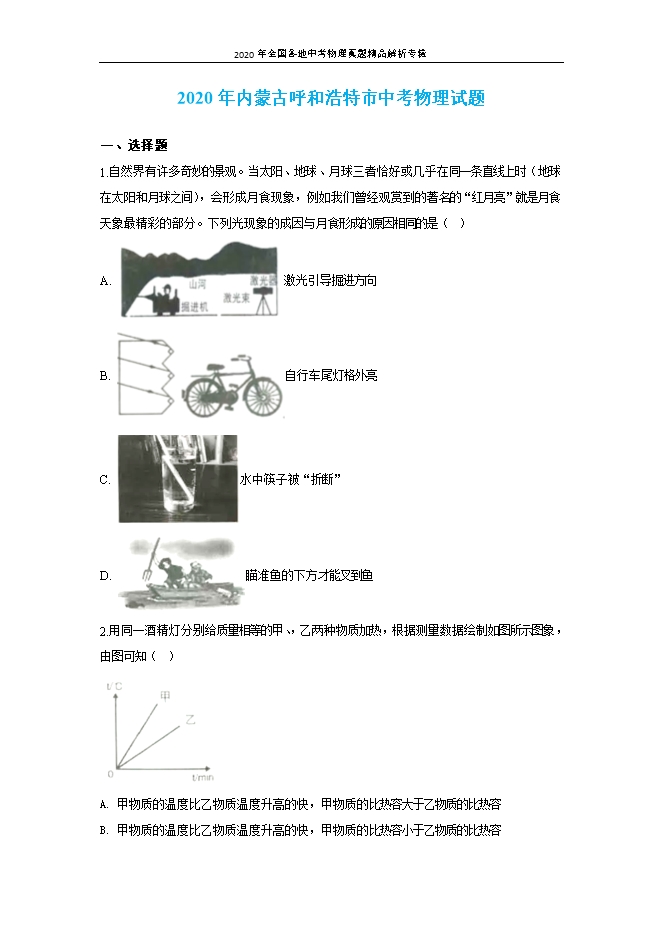 2020年全国各地中考物理真题精品解析专辑:内蒙古呼和浩特卷(word解析版和原卷版)