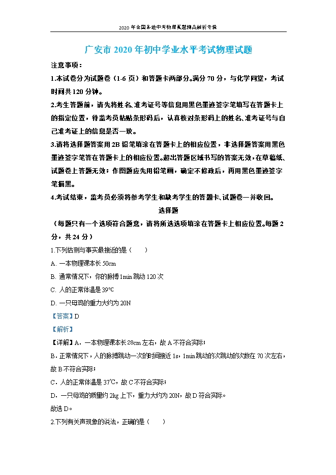 2020年全国各地中考物理真题精品解析专辑:四川广安卷(word解析版和原卷版)