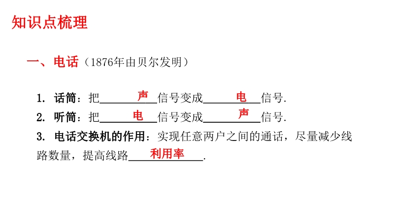 【内容简介】一、电话(1876年由贝尔发明)1. 话筒:把 信号变成 信号. 2. 听筒:把 信号变成 信号. 3. 电话交换机的作用:实现任意两户之间的通话,尽量减少线路数量,提高线路 . 4. 模拟通信和数字通信:(1)电话信号分为模拟信号和 信号两种. (2)模拟信号:在模拟通信中,话筒将声音转化成信号电流时,这种信号电流的频率、振幅变化情况跟声音的频率、振幅变化情况完全一样,“模仿”着 信号的“一举一动”. 采用模拟信号的通信方式叫做 通信. (3)数字信号:用不同 的不同组合表示的信号. 使用数字信号的通信方式叫做数字通信.