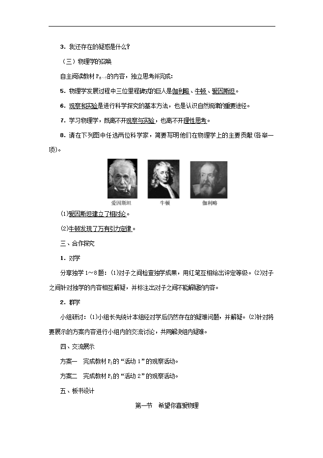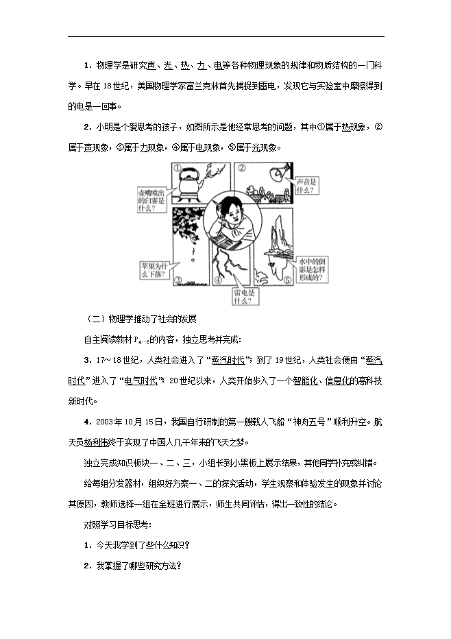 【内容简介】教学目标1.了解一些有趣的物理现象,认识物理学是研究物理现象的规律和物质结构的科学。2.认识研究和学习物理学的方法:观察和实验、归纳和数学分析、建立概念和探究规律、理性思维等。3.初步体会实验对物理的重要性,了解物理学在社会发展和人类文明进程中所起的作用。4.知道物理学推动了社会的发展,了解物理学家的贡献,增强学习物理的兴趣。教学重点通过观察、实验、阅读、讨论交流等形式激发学生的学习兴趣。教学难点认识研究问题运用的科学方法。课时安排1课时课前准备课件教学过程一、导入新课你们在日常生活中看到过哪些关于声、光、热、力、电等的物理现象?这节课,我们就一起来探究学习《第一节 希望你喜爱物理》的相关知识。(板书课题)二、自学互研(一)物理学就在你我身边自主阅读教材P2~3的内容,独立思考并完成:1.物理学是研究声、光、热、力、电等各种物理现象的规律和物质结构的一门科学。早在18世纪,美国物理学家富兰克林首先捕捉到雷电,发现它与实验室中摩擦得到的电是一回事。2.小明是个爱思考的孩子,如图所示是他经常思考的问题,其中①属于热现象,②属于声现象,③属于力现象,④属于电现象,⑤属于光现象。 (二)物理学推动了社会的发展自主阅读教材P4~6的内容,独立思考并完成:3.17~18世纪,人类社会进入了“蒸汽时代”;到了19世纪,人类社会便由“蒸汽时代”进入了“电气时代”;20世纪以来,人类开始步入了一个智能化、信息化的高科技新时代。4.2003年10月15日,我国自行研制的第一艘载人飞船“神舟五号”顺利升空。航天员杨利伟终于实现了中国人几千年来的飞天之梦。独立完成知识板块一、二、三,小组长到小黑板上展示结果,其他同学补充或纠错。给每组分发器材,组织好方案一、二的探究活动,学生观察和体验发生的现象并讨论其原因,教师选择一组在全班进行展示,师生共同评估,得出一致性的结论。对照学习目标思考: