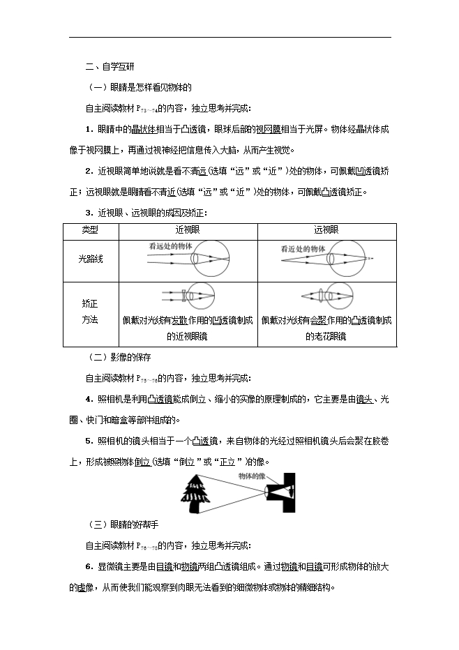 【内容简介】教学目标1.知道眼睛的成像原理,知道近视眼和远视眼的成因和矫正方法。2.知道照相机的成像原理和构造。3.能利用显微镜观察微小物体和利用望远镜观察较远的物体,会对显微镜和望远镜进行相应操作。4.通过探索活动,体验探究的乐趣,使学生乐于观察试验。5.了解望远镜和显微镜的发展历程,初步认识科学技术对于社会发展和人类生活水平的影响。教学重点显微镜、望远镜的原理。教学难点通过两个透镜组合得出显微镜、望远镜的成像情况以及原理。课时安排1课时课前准备课件教学过程一、导入新课探索是人与生俱来的天性,要探索就需要观察,要观察就要借助眼睛,并期望加以扩展,正是透镜的发明和使用,才使人类的这种愿望得以实现。利用透镜我们可以观察到不同的像,如果我们透镜组合起来观察物体,又会有怎样的发现呢?这节课,我们就一起来探究学习《第七节 眼睛与光学仪器》的相关知识。(板书课题)二、自学互研(一)眼睛是怎样看见物体的自主阅读教材P73~74的内容,独立思考并完成:1.眼睛中的晶状体相当于凸透镜,眼球后部的视网膜相当于光屏。物体经晶状体成像于视网膜上,再通过视神经把信息传入大脑,从而产生视觉。2.近视眼简单地说就是看不清远(选填“远”或“近”)处的物体,可佩戴凹透镜矫正;远视眼就是眼睛看不清近(选填“远”或“近”)处的物体,可佩戴凸透镜矫正。3.近视眼、远视眼的成因及矫正:类型近视眼远视眼光路线 矫正方法 佩戴对光线有发散作用的凹透镜制成的近视眼镜 佩戴对光线有会聚作用的凸透镜制成的老花眼镜(二)影像的保存自主阅读教材P75~76的内容,独立思考并完成:4.照相机是利用凸透镜能成倒立、缩小的实像的原理制成的,它主要是由镜头、光圈、快门和暗盒等部件组成的。5.照相机的镜头相当于一个凸透镜,来自物体的光经过照相机镜头后会聚在胶卷上,形成被照物体倒立(选填“倒立”或“正立”)的像。
