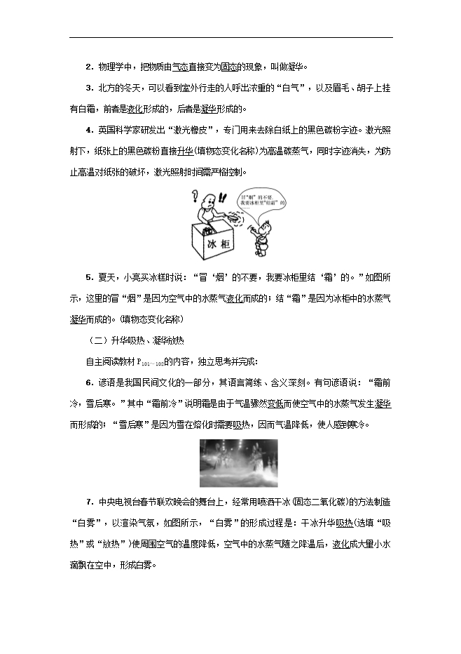 【内容简介】教学目标1.知道升华和凝华的概念,知道升华吸热,凝华放热。2.了解生活中的升华和凝华现象,并能用物理的语言进行解释。3.学会根据观察结果进行间接分析,从而推断出物理过程的思维方法。4.培养学生的实践操作能力,观察能力,分析推理的能力,同时培养学生手脑并用,理论联系实际和语言的口头表达能力。教学重点知道升华要吸热,凝华要放热。教学难点知道升华和凝华的条件,升华要吸热,凝华要放热。课时安排1课时课前准备课件教学过程一、导入新课烈日当空,久旱无雨,为了解决旱情,过去人们往往摆起香案,祈祷“龙王爷”恩赐,结果滴雨未下;而现今,用飞机在高空投撤了一些固态物质,顷刻间下起了大雨。那这种固态物质是什么呢?它为什么能促使雨的形成?这节课,我们就一起来探究学习《第四节 升华和凝华》的相关知识。(板书课题)二、自学互研(一)升华和凝华自主阅读教材P100~102的内容,独立思考并完成:1.物理学中,把物质由固态直接变成气态的现象,叫做升华。2.物理学中,把物质由气态直接变为固态的现象,叫做凝华。3.北方的冬天,可以看到室外行走的人呼出浓重的“白气”,以及眉毛、胡子上挂有白霜,前者是液化形成的,后者是凝华形成的。4.英国科学家研发出“激光橡皮”,专门用来去除白纸上的黑色碳粉字迹。激光照射下,纸张上的黑色碳粉直接升华(填物态变化名称)为高温碳蒸气,同时字迹消失,为防止高温对纸张的破坏,激光照射时间需严格控制。   5.夏天,小亮买冰糕时说:“冒‘烟’的不要,我要冰柜里结‘霜’的。”如图所示,这里的冒“烟”是因为空气中的水蒸气液化而成的;结“霜”是因为冰柜中的水蒸气凝华而成的。(填物态变化名称)(二)升华吸热、凝华放热自主阅读教材P101~102的内容,独立思考并完成:6.谚语是我国民间文化的一部分,其语言简练、含义深刻。有句谚语说:“霜前冷,雪后寒。”其中“霜前冷”说明霜是由于气温骤然变低而使空气中的水蒸气发生凝华而形成的;“雪后寒”是因为雪在熔化时需要吸热,因而气温降低,使人感到寒冷。