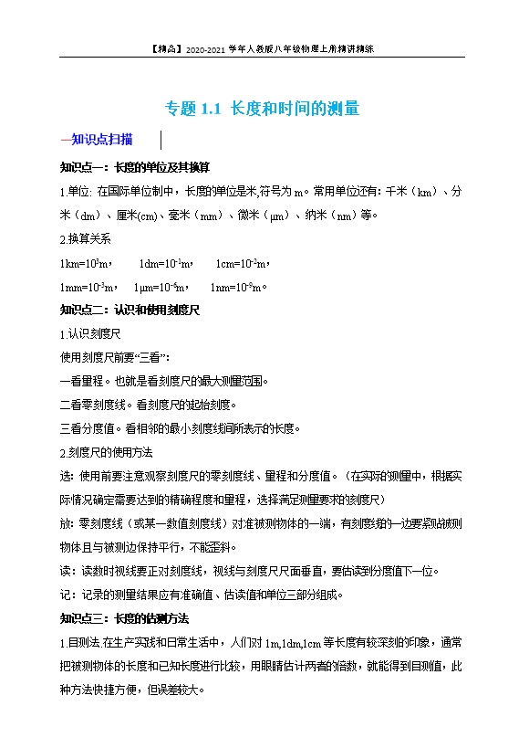 【精品】2020-2021学年人教版八年级物理上册精讲精练:1.1长度和时间的测量(原卷版和解析版)