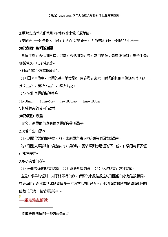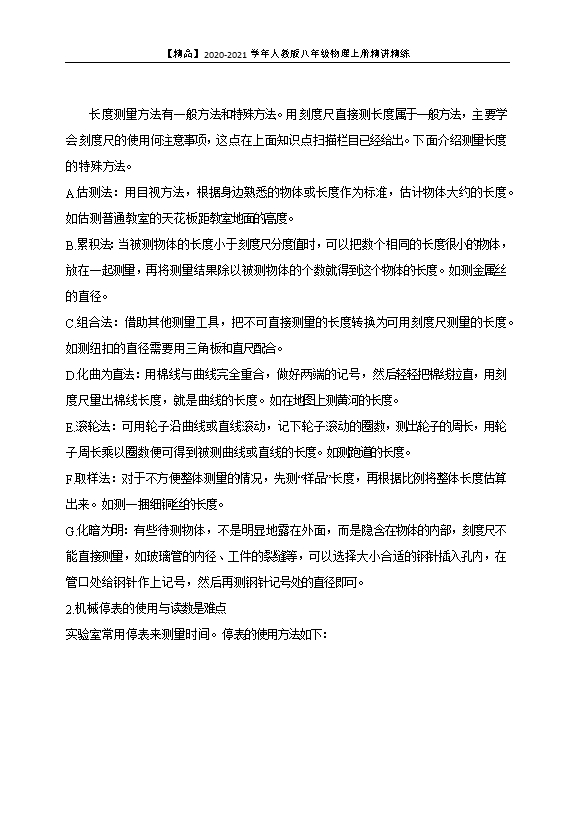 【内容简介】知识点一:长度的单位及其换算1.单位: 在国际单位制中,长度的单位是米,符号为m。常用单位还有:千米(km)、分米(dm)、厘米(cm)、毫米(mm)、微米(μm)、纳米(nm)等。2.换算关系 1km=103m, 1dm=10-1m, 1cm=10-2m, 1mm=10-3m, 1μm=10-6m, 1nm=10-9m。知识点二:认识和使用刻度尺1.认识刻度尺使用刻度尺前要“三看”:一看量程。也就是看刻度尺的最大测量范围。二看零刻度线。看刻度尺的起始刻度。三看分度值。看相邻的最小刻度线间所表示的长度。2.刻度尺的使用方法选:使用前要注意观察刻度尺的零刻度线、量程和分度值。(在实际的测量中,根据实际情况确定需要达到的精确程度和量程,选择满足测量要求的刻度尺)放:零刻度线(或某一数值刻度线)对准被测物体的一端,有刻度线的一边要紧贴被测物体且与被测边保持平行,不能歪斜。读:读数时视线要正对刻度线,视线与刻度尺尺面垂直,要估读到分度值下一位。记:记录的测量结果应有准确值、估读值和单位三部分组成。知识点三:长度的估测方法1.目测法.在生产实践和日常生活中,人们对1m,1dm,1cm等长度有较深刻的印象,通常把被测物体的长度和已知长度进行比较,用眼睛估计两者的倍数,就能得到目测值,此种方法快捷方便,但误差较大。2.手测法.古代人们常用“拃”和”指”来做长度单位。3.步测法.“一步”是指人们步行时两足尖的距离,因为年龄不同,步伐的大小不一。知识点四:时间的测量1.测量工具:古代用日晷、沙漏。现代用钟,表。常用的钟、表有:石英钟,电子手表,机械停表,电子停表等。2.时间的单位及其换算关系(1)国际单位中,时间的基本单位是秒 用符号s 表示;时间的其他单位还有时(h)、分(min)、毫秒(ms)、微秒(μs)。(2)它们之间的换算关系1h=60min, 1min=60s, 1s=1000ms, 1ms=1000μs 3.机械停表的使用与读数知识点五:误差1.定义:测量值与真实值之间的差别叫误差。2.误差产生的原因(1)测量仪器的精密度不够,或测量方法不够完善等原因造成误差(2)测量人读数时估读造成的。读数时,要估读到分度值的下一位,估读值与真实值可能有差异。3.减小误差的方法(1)采用精密的测量仪器;(2)改进测量方法;(3)多次测量,求平均值。注意:求平均值时,对于除不尽的数,保留的小数位数应与测量值的小数位数相同。在计算时,要计算到比测量值多一位数字后再四舍五入,平均值应保留与测量值相同的位数(只有一位估读数字)。 1.掌握长度测量的一些方法是重点长度测量方法有一般方法和特殊方法。用刻度尺直接测长度属于一般方法,主要学会刻度尺的使用何注意事项,这点在上面知识点扫描栏目已经给出。下面介绍测量长度的特殊方法。A.估测法:用目视方法,根据身边熟悉的物体或长度作为标准,估计物体大约的长度。如估测普通教室的天花板距教室地面的高度。B.累积法:当被测物体的长度小于刻度尺分度值时,可以把数个相同的长度很小的物体,放在一起测量,再将测量结果除以被测物体的个数就得到这个物体的长度。如测金属丝的直径。C.组合法:借助其他测量工具,把不可直接测量的长度转换为可用刻度尺测量的长度。如测纽扣的直径需要用三角板和直尺配合。D.化曲为直法:用棉线与曲线完全重合,做好两端的记号,然后轻轻把棉线拉直,用刻度尺量出棉线长度,就是曲线的长度。如在地图上测黄河的长度。E.滚轮法:可用轮子沿曲线或直线滚动,记下轮子滚动的圈数,测出轮子的周长,用轮子周长乘以圈数便可得到被测曲线或直线的长度。如测跑道的长度。F.取样法:对于不方便整体测量的情况,先测“样品”长度,再根据比例将整体长度估算出来。如测一捆细铜丝的长度。G.化暗为明:有些待测物体,不是明显地露在外面,而是隐含在物体的内部,刻度尺不能直接测量,如玻璃管的内径、工件的裂缝等,可以选择大小合适的钢针插入孔内,在管口处给钢针作上记号,然后再测钢针记号处的直径即可。2.机械停表的使用与读数是难点
