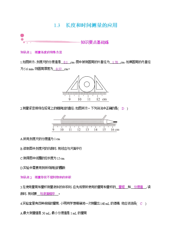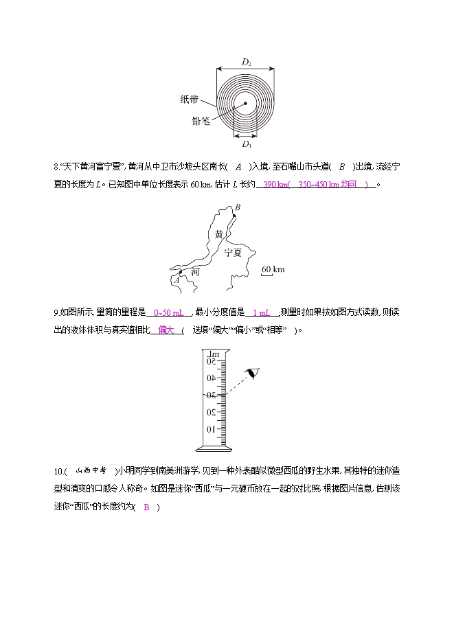 【内容简介】知识点1 测量长度的特殊方法1.如图所示,刻度尺的分度值是 0.1 cm,图中被测圆筒的外直径为 1.70 cm,如果圆筒的内直径为5.6 mm,则圆筒厚度为 0.57 cm。 2.测量紧密排绕在铅笔上的细铜丝的直径,如图所示。下列说法中正确的是( D ) A.所用刻度尺的分度值为1 cmB.读取图中刻度尺的示数时,视线应与尺面平行C.测得图中线圈的总长度为15 cmD.实验中需要用到所绕铜丝的圈数知识点2 测量形状不规则物体的体积3.在使用量筒和量杯测量液体的体积时,应先观察所使用的量筒和量杯的 量程 和 分度值 ,读数时,视线要 与液面相平 。 4.实验室里有四种规格的量筒,小明同学想精确地一次测量出140 mL的酒精,他应该选择( C )A.最大测量值是50 mL,最小分度值是1 mL的量筒B.最大测量值是100 mL,最小分度值是2 mL的量筒C.最大测量值是250 mL,最小分度值是5 mL的量筒D.最大测量值是500 mL,最小分度值是10 mL的量筒知识点3 你身上的“尺”和“表”5.“估测”是物理学中常用的一种方法,我们可以运用身体上的某个器官或部位进行一些物理量的估测。例如,利用手臂的长度可以估测一个物体的长度。你还可以利用身体的 脉搏跳动( 或心跳 ) 估测时间。 6.学习物理后,张杰同学对于身边物理量的大小非常关注,他进行了下列估测:①手上大拇指指甲的宽度约为1.2 cm;②从教学楼的第一层爬到第三层,人升高的高度约为20 cm;③大拇指的长度约为0.6 dm;④整个手掌的长度约为1.5 m。则以上估测中比较合理的是( D )A.①②③B.①③④C.②③D.①③ 综合能力提升练7.小亮学习了长度的测量后,想测量纸带的厚度,他将厚薄均匀的一条长纸带紧密地环绕在圆柱形铅笔上,如图所示,已知纸带环绕了n圈,纸带的外径为D2,铅笔的外径为D1,则纸带的厚度是 (D_2-D_1)/2n 。 8.“天下黄河富宁夏”,黄河从中卫市沙坡头区南长( A )入境,至石嘴山市头道( B )出境,流经宁夏的长度为L。已知图中单位长度表示60 km,估计L长约 390 km( 350~450 km均可 ) 。 9.如图所示,量筒的量程是 0~50 mL ,最小分度值是 1 mL ;测量时如果按如图方式读数,则读出的液体体积与真实值相比 偏大 ( 选填“偏大”“偏小”或“相等” )。