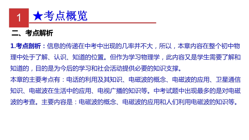 【内容简介】二、考点解析1.考点剖析:信息的传递在中考中出现的几率并不大,所以,本章内容在整个初中物理中处于了解、认识、知道的位置。但作为学习物理学,此内容又是学生需要了解和知道的,目的是为今后的学习和社会活动提供必要的知识支撑。本章的主要考点有:电话的利用及其知识、电磁波的概念、电磁波的应用、卫星通信知识、电磁波在生活中的应用、电视广播的知识等。中考试题中出现最多的是对电磁波的考查。主要内容是:电磁波的概念、电磁波的应用和人们利用电磁波的知识等。2.常考题型:出现本章考题,题型以选择题为主,也曾出现填空题,但较少。考查内容多数是知识性、基础性和概念性,一般不会太难,只要学生能够理解有关知识,解答会较容易。从考查的知识点来看,一般情况下单独作为一个考题的不多,常见的是与其他章节知识点结合在一起进行考查。所以,在进行复习时,抓住这些特点会对本章的复习起到事半功倍的效果。3.考点分类:考点分类见下表考点分类考点内容考点分析与常见题型常考热点电磁波概念与应用选择题居多,考查对电磁波的认识及其有关应用知识一般考点无线通讯知识选择题居多,考查无线通讯的知识冷门考点电话、电视知识选择题居多,考查对电话和电视的认识★知识点精析一、现代顺风耳-电话 1.现代顺风耳-电话(1)电话的组成:话筒-把声信号变成变化的电流信号;听筒-把变化的电流信号变成声音信号。(2)电话的工作原理:声音→话筒→产生变化的电流→听筒→振动(声音)。(3)电话交换机:1)为了提高电话线路的利用率而发明的;2)用来实现两部电话之间的转换;3)使用交换机,可以大幅度的减少电话线的数量。(4)电话“占线”原因:1)对方电话没有扣好;2)对方正在通话;3)电话交换机忙。2.模拟通信和数字通信(1)模拟信号:在话筒将声音转换成电流信号时,信号电流的频率,振幅变化的情况跟声音的频率、振幅变化情况完全一样,模仿声音的“一举一动”这种电流传递的信号叫模拟信号。模拟通信:使用模拟信号的通信方式叫模拟通信,例如:传统的市话通话,长途通话。(2)数字信号:用不同符号的不同组合表示的信号叫做数字信号。数字通信:使用数字信号通信的方式叫数字通信,例如电子计算机是利用二进制码识别信息和处理信息。(3)模拟通信在加工,放大和传输过程中抗干扰能力差,噪声大,失真大;而数字信号形式简单,抗干扰能力强,噪声小,失真小。(4)电话交换机间的信息是靠数字信号传递,而电话与电话机之间的信息传递靠模拟信号,但是不论哪种通信都需要电话线。二、电磁波的海洋1.电磁波:如果在空间某处产生一个随时间变化的电场,这个电场就会产生磁场,如果这个磁场也随时间变化,那么它又会在空间产生新的电场,这个变化的电场,磁场并不局限于空间某个区域,而是由远及近的传播出去,这样的传播就形成了电磁波,即导体中电流的迅速变化在空间激起电磁波。2.电磁波性质:是一种看不见摸不到的特殊物质,可以在真空中传播,传播不需要介质;电磁波传播的速度c=3×108m/s,电磁波的波长为λ,波速c=λf,其中f是电磁波的频率;电磁波的波谱:γ射线,X射线,紫外线,红外线,微波,短波,中波,长波。3.电磁波的发射和接收1)发射:将要传输的电信号(音频信号,图像信号)加载到高频电磁波(载波)上,再通过天线发射到空中的过程。2)接收:天线将电磁波接收下来,再通过接收器(收音机,电视机等)将要传输的电信号取出来并放大,最后还原成声音或图像过程。3)“天线”可以同时接收多种频率的电磁波,利用调谐器可以选出人们所需要的频率。4.电磁波的应用1)微波炉:利用电磁波(波长很短的微波)来加热食品。2)雷达:利用无线电波测定物体位置的无线电设备;工作原理:电磁波如果遇到尺寸明显大于波长的障碍物就要发生反射,雷达就是利用电磁波的这个原理,波长越短,传播直线性越好,反射性能越强。3)无线电波:电磁波中用于广播、电视和移动电话的频率为数值数百千赫兹至数百兆赫兹的那部分叫做无线电波(无线电技术中使用的电磁波);根据波长的不同而有不同传播特征:分为地波,天波,空间波三种;激光:激光束平行度特别好,在传播很远的距离后仍能保持一定的强度,制成激光测距雷达;激光束的亮度高,在很小的空间和很短的时间内能集中很大的能量,利用激光束切割物质,焊接金属,医学上称作“光刀”。三、广播、电视和移动通讯