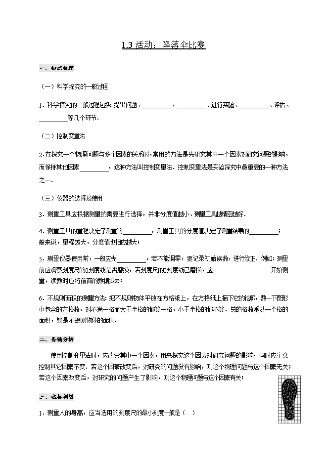 1.3 活动:降落伞比赛—2020秋教科版八年级物理上册学案(附答案)