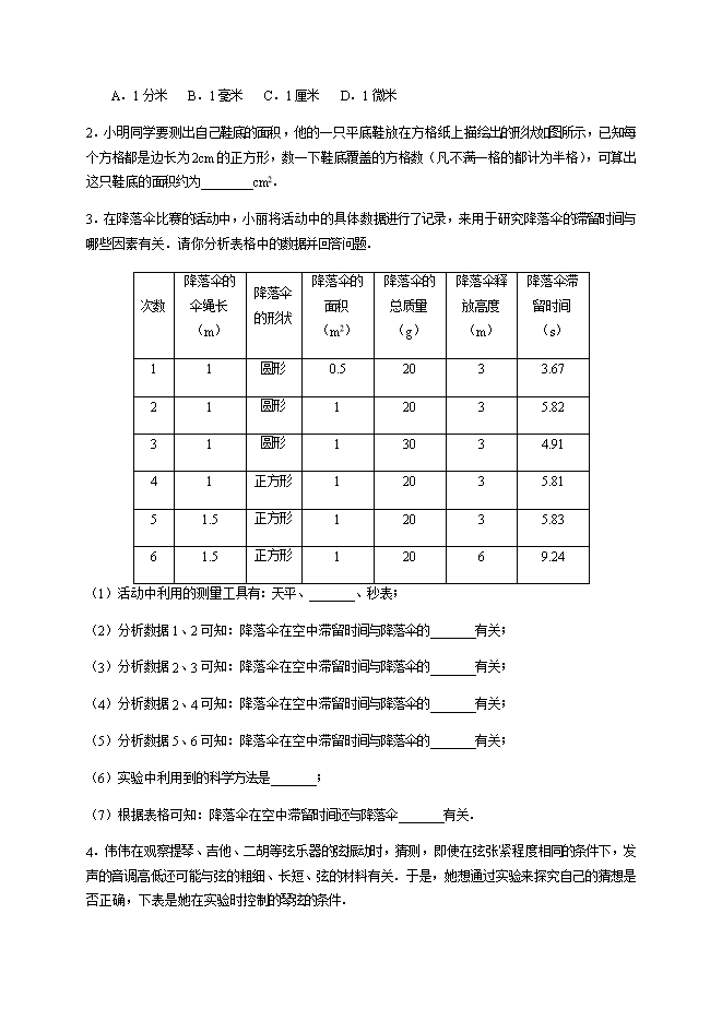 【内容简介】一、知识梳理(一)科学探究的一般过程1.科学探究的一般过程包括:提出问题、__________、__________、进行实验、__________、评估、__________等几个环节.(二)控制变量法2.在探究一个物理问题与多个因素的关系时,常用的方法是先研究其中一个因素对研究问题的影响,而保持其他因素__________,这种方法叫控制变量法.控制变量法是实验探究中最重要的一种方法之一.(三)仪器的选择及使用3.测量工具应根据测量的需要进行选择,并非分度值越小、测量工具越精密越好.4.测量工具的量程决定了测量的__________,测量工具的分度值决定了测量结果的__________;一般来说,量程越大,分度值也相应越大;5.测量仪器使用前,一般应先__________,若不能调零,要记录初始读数,进行修正.例如:测量前应观察刻度尺的0刻度线是否磨损,若刻度尺的0刻度线已磨损,应____________________开始测量,读数时应将前面的数据减去;6.不规则面积的测量方法:把不规则物体平放在方格纸上,在方格纸上描下它的轮廓,数一下图形中包含的方格数,对不满一格而大于半格的都算一格,小于半格的都不算.总的格数乘以一个格的面积,就是不规则物体的面积.二、易错分析使用控制变量法时,应改变其中一个因素,用来探究这个因素对研究问题的影响,同时应注意控制其它因素不变.若这个因素改变后,对研究的问题没有影响,则这个物理问题与这个因素无关;若这个因素改变后,对研究的问题产生了影响,则这个物理问题与这个因素有关;三、达标训练1.测量人的身高,应当选用的刻度尺的最小刻度一般是( )A.1分米B.1毫米C.1厘米D.1微米2.小明同学要测出自己鞋底的面积,他的一只平底鞋放在方格纸上描绘出的形状如图所示,已知每个方格都是边长为2cm的正方形,数一下鞋底覆盖的方格数(凡不满一格的都计为半格),可算出这只鞋底的面积约为________cm2.3.在降落伞比赛的活动中,小丽将活动中的具体数据进行了记录,来用于研究降落伞的滞留时间与哪些因素有关.请你分析表格中的数据并回答问题.次数降落伞的伞绳长(m)降落伞的形状降落伞的面积(m2)降落伞的总质量(g)降落伞释放高度(m)降落伞滞留时间(s)11圆形0.52033.6721圆形12035.8231圆形13034.9141正方形12035.8151.5正方形12035.8361.5正方形12069.24(1)活动中利用的测量工具有:天平、_______、秒表;(2)分析数据1、2可知:降落伞在空中滞留时间与降落伞的_______有关;(3)分析数据2、3可知:降落伞在空中滞留时间与降落伞的_______有关;(4)分析数据2、4可知:降落伞在空中滞留时间与降落伞的_______有关;(5)分析数据5、6可知:降落伞在空中滞留时间与降落伞的_______有关;(6)实验中利用到的科学方法是_______;(7)根据表格可知:降落伞在空中滞留时间还与降落伞_______有关.