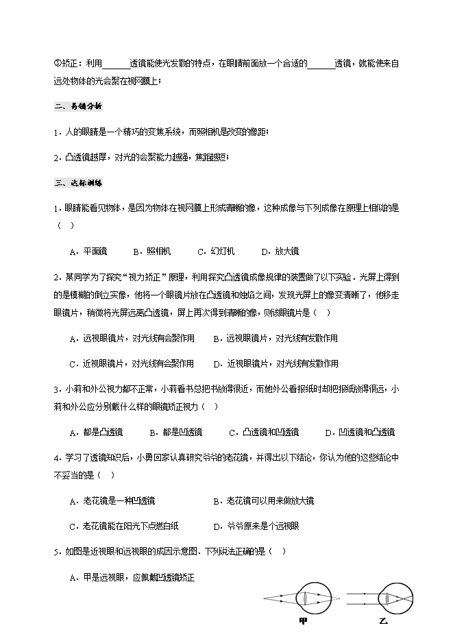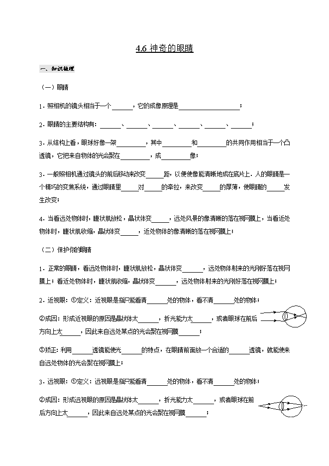 【内容简介】(一)眼睛1.照相机的镜头相当于一个_______,它的成像原理是_____________________;2.眼睛的主要结构有:_______、_______、_______、_______、_______、_______;3.从结构上看,眼球好像一架__________,其中__________和__________的共同作用相当于一个凸透镜,它把来自物体的光会聚在__________,成__________像;3.一般照相机通过镜头的前后移动来改变______距,以便使像能清晰地成在底片上.人的眼睛是一个精巧的变焦系统,通过眼睛里______对______的牵拉,来改变______的厚薄,使眼睛的______发生改变;4.当看远处物体时,睫状肌放松,晶状体变______,远处风景的像清晰的落在视网膜上,当看近处物体时,睫状肌收缩,晶状体变______,近处物体的像清晰的落在视网膜上;(二)保护你的眼睛1.正常的眼睛,看远处物体时,睫状肌放松,晶状体变_______,远处物体射来的光刚好落在视网膜上;看近处物体时,睫状肌收缩,晶状体变_______,远处物体射来的光刚好落在视网膜上;2.近视眼:①定义:近视眼是指只能看清_______处的物体,看不清_______处的物体;②成因:形成近视眼的原因是晶状体太_______,折光能力太_______,或者眼球在前后方向上太_______,因此来自远处某点的光会聚在视网膜_______;③矫正:利用_______透镜能使光_______的特点,在眼睛前面放一个合适的_______透镜,就能使来自远处物体的光会聚在视网膜上;3.远视眼:①定义:远视眼是指只能看清_______处的物体,看不清_______处的物体;②成因:形成远视眼的原因是晶状体太_______,折光能力太_______,或者眼球在前后方向上太_______,因此来自远处某点的光会聚在视网膜_______;③矫正:利用_______透镜能使光发散的特点,在眼睛前面放一个合适的_______透镜,就能使来自远处物体的光会聚在视网膜上;二、易错分析1.人的眼睛是一个精巧的变焦系统,而照相机是改变的像距;2.凸透镜越厚,对光的会聚能力越强,焦距越短;三、达标训练1.眼睛能看见物体,是因为物体在视网膜上形成清晰的像,这种成像与下列成像在原理上相似的是( )A.平面镜B.照相机C.幻灯机D.放大镜2.某同学为了探究“视力矫正”原理,利用探究凸透镜成像规律的装置做了以下实验.光屏上得到的是模糊的倒立实像,他将一个眼镜片放在凸透镜和烛焰之间,发现光屏上的像变清晰了,他移走眼镜片,稍微将光屏远离凸透镜,屏上再次得到清晰的像,则该眼镜片是( )A.远视眼镜片,对光线有会聚作用B.远视眼镜片,对光线有发散作用C.近视眼镜片,对光线有会聚作用D.近视眼镜片,对光线有发散作用3.小莉和外公视力都不正常,小莉看书总把书放得很近,而她外公看报纸时却把报纸放得很远,小莉和外公应分别戴什么样的眼镜矫正视力( )A.都是凸透镜B.都是凹透镜C.凸透镜和凹透镜D.凹透镜和凸透镜4.学习了透镜知识后,小勇回家认真研究爷爷的老花镜,并得出以下结论,你认为他的这些结论中不妥当的是( )A.老花镜是一种凹透镜B.老花镜可以用来做放大镜C.老花镜能在阳光下点燃白纸D.爷爷原来是个远视眼