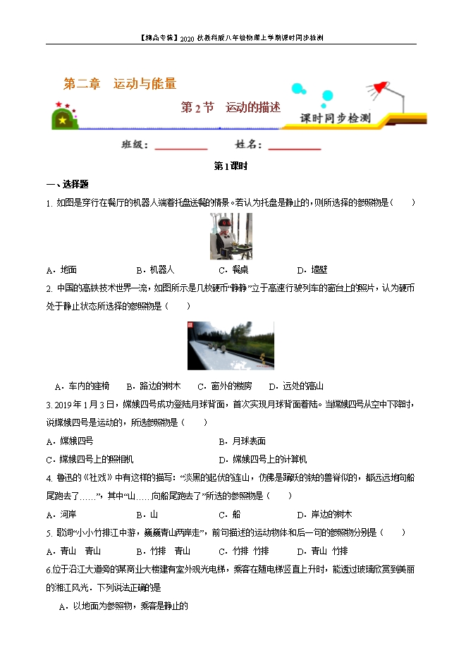 【内容简介】1. 如图是穿行在餐厅的机器人端着托盘送餐的情景。若认为托盘是静止的,则所选择的参照物是( ) A.地面B.机器人C.餐桌D.墙壁【答案】B【解析】在研究物体的机械运动时要先选择一个物体,假定该物体不动,这个物体就是参照物;如果物体的位置相对于参照物不变,则物体是静止的,如果物体的位置相对于参照物发生变化,则物体是运动的。托盘与地面、餐桌、墙壁的位置在不断的变化,以地面、餐桌、墙壁为参照物,托盘是运动的,故ACD不符合题意;机器人与托盘的位置没有变化,以机器人为参照物,托盘是静止的,故B符合题意。2. 中国的高铁技术世界一流,如图所示是几枚硬币“静静”立于高速行驶列车的窗台上的照片,认为硬币处于静止状态所选择的参照物是( ) A.车内的座椅 B.路边的树木 C.窗外的楼房 D.远处的高山【答案】A【解析】高铁上几枚硬币能“静静”立于高速行驶列车的窗台上,认为硬币处于静止状态,则参照物与硬币之间没有位置的变化,因此A选项正确。3. 2019年1月3日,嫦娥四号成功登陆月球背面,首次实现月球背面着陆。当嫦娥四号从空中下降时,说嫦娥四号是运动的,所选参照物是( )A.嫦娥四号B.月球表面C.嫦娥四号上的照相机D.嫦娥四号上的计算机【答案】B【解析】研究机械运动时,假定不动的物体叫参照物,与参照物相比,物体位置有变化,说明物体在运动;物体位置没有变化,说明物体处于静止状态。解:当嫦娥四号从空中下降时,以嫦娥四号、嫦娥四号上的照相机、嫦娥四号上的计算机为参照物,嫦娥四号与它们之间均没有位置变化,是静止的;以月球表面为参照物,嫦娥四号对于月球表面之间的位置不断发生变化,是运动的,所以说嫦娥四号是运动的,所选参照物是月球表面。4. 鲁迅的《社戏》中有这样的描写:“淡黑的起伏的连山,仿佛是踊跃的铁的兽脊似的,都远远地向船尾跑去了……”,其中“山……向船尾跑去了”所选的参照物是( )A.河岸B.山C.船D.岸边的树木【答案】C【解析】A、以河岸为参照物,山与河岸之间的位置没有发生变化,山是不动的,故A不符合题意;B、若以山本身为参照物,那它只能是静止的,而且一般是不能选研究对象为参照物,故B不符合题意;C、以船为参照物,船与山之间的距离发生了变化,而且船向前行,以船为参照物,山在“后退”,故C符合题意;D、以岸边的树为参照物,山与岸边的树的位置没有发生变化,山是不动的,故D不符合题意。5. 歌词“小小竹排江中游,巍巍青山两岸走”,前句描述的运动物体和后一句的参照物分别是( )A.青山 青山B.竹排 青山C.竹排 竹排D.青山 竹排【答案】C【解析】“小小竹排江中游”,被研究的物体是竹排,竹排在运动,竹排和青山之间的位置发生了变化,所以选择青山为参照物;“魏魏青山两岸走”,被研究的物体是青山,青山是运动的,青山和竹排之间的位置发生了变化,所以选择竹排为参照物;由此可知,前句描述的运动物体是竹排,后一句的参照物是竹排,故C符合题意。6.位于沿江大道旁的某商业大楼建有室外观光电梯,乘客在随电梯竖直上升时,能透过玻璃欣赏到美丽的湘江风光.下列说法正确的是A.以地面为参照物,乘客是静止的B.以地面为参照物,电梯是静止的C.以乘客为参照物,电梯是静止的D.以乘客为参照物,地面是向上运动的【答案】C【解析】A、以地面为参照物,乘客位置不断变化,所以是运动的,故A不正确;B、以地面为参照物,电梯位置不断变化,所以是运动的,故B不正确;C、以乘客为参照物,电梯位置没有变化,所以是静止的,故C正确;D、以乘客为参照物,地面位置不断变化,所以是向下运动的,故D不正确。故选C。7. 2019年1月3日,“玉兔二号”从停稳在月球表面的“嫦娥四号”上沿轨道缓缓下行,到达月球表面,如图所示。关于“玉兔二号”下行的过程,下到说中正确的是( )