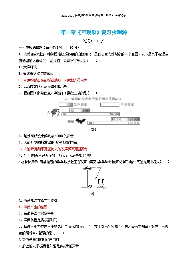 【内容简介】一、单项选择题(每小题3分,共30分)1.有关研究指出,楼倒塌后缺乏必要的自救知识,是使丧生人数增多的一个原因。以下是关于被埋在废墟里的人自救的一些措施,最有效的方法是( )A.大声呼救B.静等着人员前来营救C.用硬物敲击预制板或墙壁,向营救人员求救D.见缝隙就钻,从废墟中爬出来2.根据图1所给信息,判断下列说法正确的是( ) 图1A.蝙蝠可以发出频率为400Hz的声音B.人能听到蝙蝠发出的所有频率的声音C.人的听觉频率范围比人的发声频率范围要大D.15Hz的声音只要振幅足够大,人耳是能听到的3.如图2所示,用悬挂着的乒乓球接触正在发声的音叉,乒乓球会被多次弹开。这个实验是用来探究( ) 图2A.声音能否在真空中传播B.声音产生的原因C.音调是否与频率有关D.声音传播是否需要时间4.唐诗《枫桥夜泊》中的名句“姑苏城外寒山寺,夜半钟声到客船”中包含着声学知识。对其中声现象的解释中,错误的是( )A.钟声是由钟的振动产生的B.船上的人根据音色知道是钟发出的声音C.钟声通过空气传播到客船D.船上的人都认为钟发出的声音是噪声5.医生用听诊器给病人诊病是因为( )A.听诊器能使振动的振幅增加,响度增大B.听诊器能改变发声体的频率,使音调变高C.听诊器减少声音的分散,使传入人耳的声音响度更大一些D.听诊器能缩短听者和发声体之间的距离,使传入人耳的振动幅度更大一些6.下列对声现象的描述,应用物理知识解释正确的是( )A.“悦耳动听”说明声音的响度较大B.“隔墙有耳”说明墙体可以传播声音C.“闻其声而知其人”说明根据音调可以辨别来人是谁D.“大雪过后,万籁俱寂”说明大雪会使声音 完全消失7.关于声现象下列说法错误的是( )A.诗句“不敢高声语,恐惊天上人”中的“高”是指声音的音调高B.两名宇航员在太空中不能直接对话,是因为声音不能在真空中传播C.旋转按钮可以调节喇叭发生声音的大小,改变的是声音的响度D.听不同乐器弹奏同一首歌曲时能分辨出所用乐器,是利用了声音的音色不同8.下列的实验和实例,能说明声音的产生或传播条件的一组是( )①在鼓面上放些碎纸屑,敲鼓时可观察到纸屑在不停地跳动;②放在真空罩里的手机当来电时,只见指示灯闪烁,听不见铃声;③拿一张硬纸片,让它在木梳齿上划过,一次快些,一次慢些,比较两次的不同;④锣发声时用手按住锣,锣声就消失了。A.①②③B.②③④C.①③④D.①②④