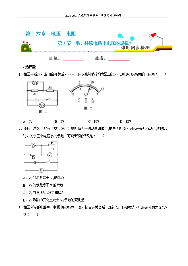 【精品】2020-2021人教版九年级全一册课时同步检测:16.2 串、并联电路中电压的规律(原卷版和解析版)