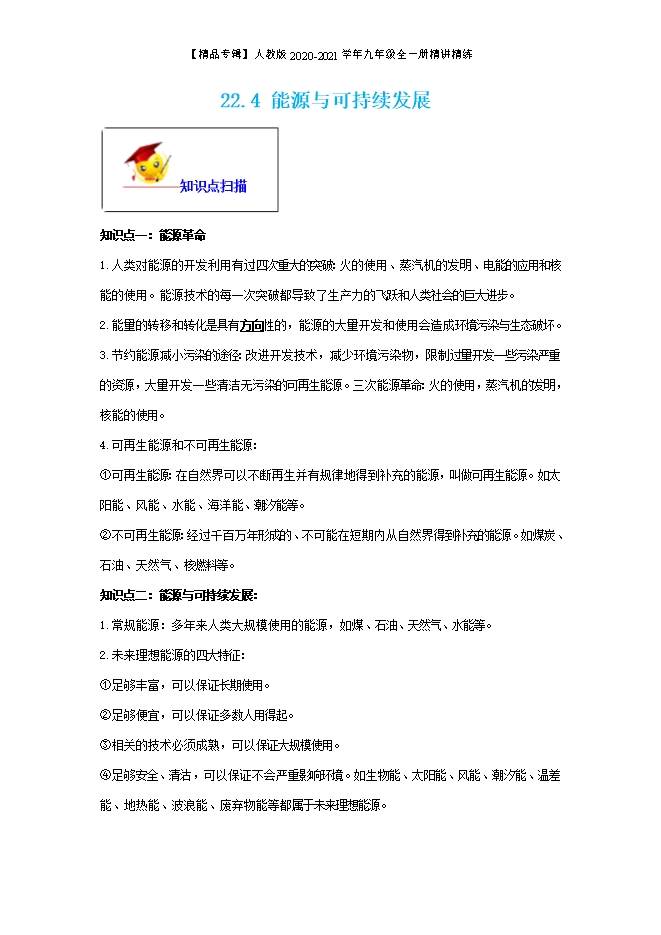 【内容简介】知识点一:能源革命1.人类对能源的开发利用有过四次重大的突破:火的使用、蒸汽机的发明、电能的应用和核能的使用。能源技术的每一次突破都导致了生产力的飞跃和人类社会的巨大进步。2.能量的转移和转化是具有方向性的,能源的大量开发和使用会造成环境污染与生态破坏。3.节约能源减小污染的途径:改进开发技术,减少环境污染物,限制过量开发一些污染严重的资源,大量开发一些清洁无污染的可再生能源。三次能源革命:火的使用,蒸汽机的发明,核能的使用。4.可再生能源和不可再生能源:①可再生能源:在自然界可以不断再生并有规律地得到补充的能源,叫做可再生能源。如太阳能、风能、水能、海洋能、潮汐能等。②不可再生能源:经过千百万年形成的、不可能在短期内从自然界得到补充的能源。如煤炭、石油、天然气、核燃料等。知识点二:能源与可持续发展:1.常规能源:多年来人类大规模使用的能源,如煤、石油、天然气、水能等。2.未来理想能源的四大特征:①足够丰富,可以保证长期使用。②足够便宜,可以保证多数人用得起。③相关的技术必须成熟,可以保证大规模使用。④足够安全、清沽,可以保证不会严重影响环境。如生物能、太阳能、风能、潮汐能、温差能、地热能、波浪能、废弃物能等都属于未来理想能源。 重点记忆:1.越用越少,不可能在短期内从自然界得到补充的能源,叫不可再生能源,如化石能源、核能;可以在自然界里源源不断地得到的能源,叫可再生能源,如水能、风能、太阳能、生物质能.2.未来理想能源的条件(1)必须足够丰富,保证长期使用.(2)必须足够便宜,能使多数人用得起.(3)相关技术必须成熟,能大规模使用.(4)必须足够安全、清洁,不能严重影响环境. 知识点一:能源革命【例题1】(2019江苏南京)下列能源中,属于可再生能源的是( )A.天然气B.煤C.石油D.风能【答案】D【解析】从能源是否可再利用的角度可分为可再生能源和不可再生能源。化石能源、核能会越用越少,不可能在短期内从自然界得到补充,所以它们属于不可再生能源;而风能、水能、太阳能、生物质能,可以在自然界里源源不断的得到补充,所以它们属于可再生能源。天然气、煤、石油都属于不可再生能源,只有风能可以在自然界里源源不断的得到补充,是可再生能源,故D正确、ABC错误。知识点二:能源与可持续发展:【例题2】(2019广西桂林)为了减少能源的利用对环境的污染和破坏,下列做法不正确的是( )A.大力发展风力发电B.大力发展火力发电C.减少化石燃料的使用D.开发使用电能驱动的电动汽车【答案】B【解析】火力发电厂,通过大量燃烧媒炭等化石资源来发电,导致空气中CO:等温室气体含量过高,破坏环境。 1.自然界有些能源一旦消耗就很难再生,因此我们要节约能源。下列能源属于不可再生能源的是( )A.石油B.风能C.水能D.太阳能【答案】A【解析】太阳能、水能、风能等在短时间内可以再次产生,是可再生能源,化石能源是短时间内不能再次产生的,是不可再生能源,故A符合题意。2.太阳能是未来的理想能源,它是清洁的 再生能源(选填“可”、或“不可”);行驶中的太阳能汽车,其太阳能电池将太阳能直接转化为电能,进而再转化为汽车的 能。【答案】可、机械。【解析】太阳能是可再生能源,电动机将电能转化为机械能。3.进入新时代,各国都在大力发展理想能源,未来的理想能源要能够大规模替代石油、煤炭和天然气等常规能源,对理想能源满足的条件说法正确的是( )A.必须足够丰富,可以保证长期使用;B.必须足够便宜,可以保证多数人用得起;C.相关技术必须成熟,可以保证大规模使用;D.足够安全、清洁,不用考虑对环境的影响。【答案】ABC 【解析】石油、煤炭和天然气等常规能源逐渐枯竭,即使大量存在,也严重影响人们生活环境,造成危害,与生态文明建设背道而驰。理想能源它必须满足以下几个条件:第一,必须足够丰富,可以保证长期使用;第二,必须足够便宜,可以保证多数人用得起;第三,相关技术必须成熟,可以保证大规模使用;第四,必须足够安全、清洁,可以保证不会严重影响环境。所以D项说法错误。ABC说法正确。