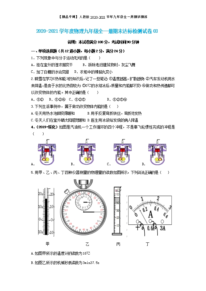 【内容简介】1.下列现象中与分子运动无关的是( )A.挂在室外的湿衣服变干 B.拆除老旧建筑物时,灰尘飞舞C.加了白糖的水会变甜 D.衣柜中的樟脑丸变小【答案】B【解析】本题的关键是分子运动是看不见的,在不知不觉中发生了变化,分子运动属于扩散现象。A.湿衣服变干是由于水分子不断运动到空气中的缘故。故A错误。B.拆除老旧建筑物时,灰尘飞舞,属于机械运动。故B正确。C.加了白糖的水会变甜,是白糖分子运动的结果,是分子运动。故C错误。D.衣柜中的樟脑丸变小,是樟脑分子运动的结果。故D错误。2.晓雪在学习《热和能》的知识后,记了一些笔记:①温度越高,扩散越快:②汽车发动机用水来降温,是由于水的比热容较大:③0℃的水结冰后,质量和内能都不变;④做功和热传递都可以改变物体的内能。其中正确的是( )A.①② B.①②④ C.①②③D.①②③④【答案】B【解析】解决本题需掌握:①温度越高,扩散现象越明显。②水的比热容大,在同样吸放热的情况下,温度变化小。③物体所含物质的多少叫质量,质量是物体本身的一种属性,与物体所含物质的多少有关,与物体的形状、状态、位置和温度无关;物质由液态变为固态是凝固,凝固放热。物体的温度越高内能越大,温度越低,内能越小。④做功和热传递是改变物体内能的两种途径。3.下列生活事例中,属于做功改变物体内能的是( )A.冬天用热水泡脚变得暖和B.用手反复弯折铁丝,弯折处发热C.冬天人们在室外晒太阳感觉暖和D.医生用冰袋给发烧的病人降温【答案】B【解析】用热水泡脚、晒太阳和用冰袋降温,都是利用热传递的方式改变内能,故A、C和D均不符合题意;用手反复弯折铁丝,弯折处发热,温度升高,内能增大,是通过做功的方式增大了铁丝的内能,故B符合题意。4.(2019•绥化)如图是汽油机一个工作循环的四个冲程,不是靠飞轮惯性完成的冲程是( )A. B. C. D. 【答案】B 【解析】在汽油机的四个冲程中只有做功冲程对外做功,其他三个冲程都是靠飞轮的惯性完成的。A图:排气门打开,活塞向上运动,气缸容积减小,是排气冲程,不符合题意;B图:两气门都关闭,活塞向下运行,火花塞点火,气缸容积增大,是做功冲程,符合题意;C图:两气门都关闭,活塞向上运行,气缸容积减小,是压缩冲程,不符合题意;D图:进气门打开,活塞向下运行,气缸容积增大,是吸气冲程,不符合题意。5.用甲、乙、丙、丁四种仪器测量的物理量的读数如图所示,下列说法正确的是( ) 甲 乙 丙 丁A.如图甲所示的温度计的读数为18℃B.如图乙所示的机械秒表读数为3min37.5sC.如图丙所示的量筒的读数为43mLD.如图丁所示电流表的读数为0.5A 【答案】B 【解析】A. 如图甲所的温度计一个大格代表10℃,一个大格平均分成10等份,每等份表示1℃,由于温度计测温液体的液面在0刻度上方,所以温度计读数为10℃+7℃=17℃。所以A项说法错误;B. 如图乙所示的机械秒表读数等于小盘的分钟数加上大盘的秒数。小盘分钟数是3min.由于小盘的分针超过30s,在大盘里读取的秒数37.5s。所以如图乙所示的机械秒表读数为3min37.5s。所以B项说法正确;C. 如图丙所示的量筒的的一个大格代表10 mL,一个大格平均分成了5等份,每个小格代表2 mL,液面读数为40mL+6mL=46mL,不是43mL。所以C项说法错误;D. 如图丁所示电流表是“+”、“0.6”两个接线柱接入电路中的,选用的量程是“0——0.6A”,读数时需要观察电流表表盘下面的刻度线。这时电流表表盘一个大格代表0.2A,一个大格平均分成了10等份,每等份表示0.02A。这样电流表的读数为0.1A ,不是0.5A。所以选项D说法错误。