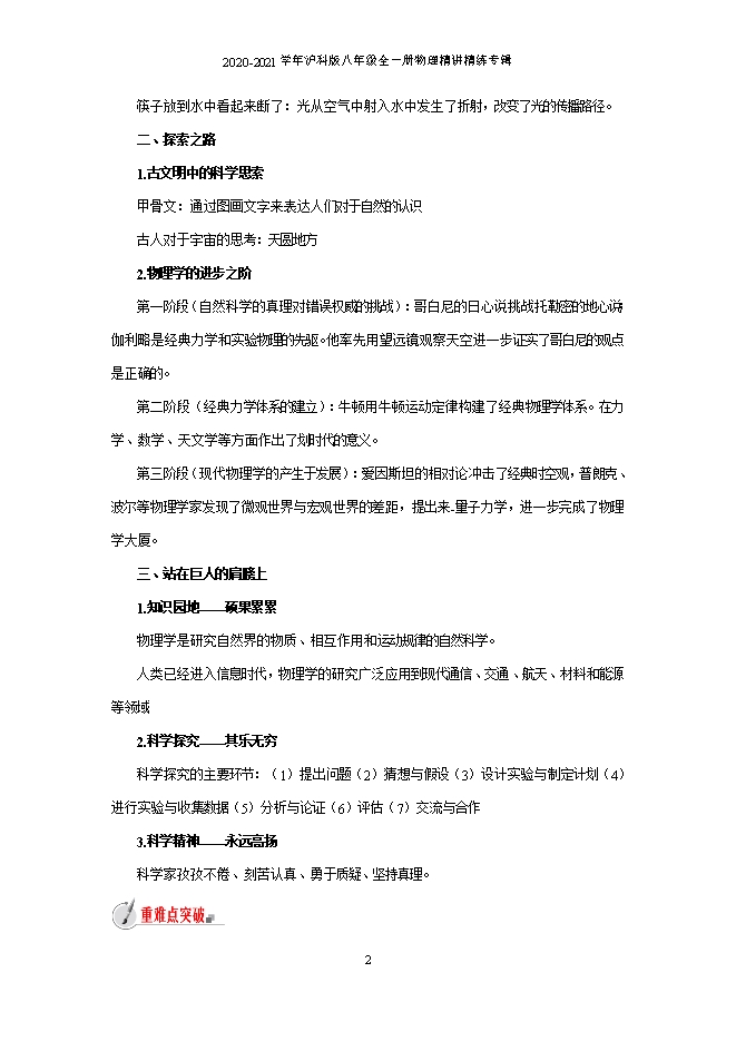 【内容简介】一、走进神奇1.大自然中的神奇哈雷彗星:哈雷彗星的公转周期为76年,下次回归时间为2061年。电闪雷鸣:闪电是云与云,云与大地之间发生的放电现象。产生的光是闪电,发出的声音为雷声。大自然的绚丽多彩:物体对于太阳光的吸收和反射不同,所以才有绚丽多彩的世界。安静的雪山为什么会发生雪崩:山坡的积雪由于重力的作用,向下滑动,引起大量的雪体崩塌。2.生活中的神奇饮料罐只有一个小孔是为何倒不出液体:饮料罐中倒出部分液体后罐中的气压小于外界的大气压,所以不容易倒出。万家灯火从何而来:万家灯火离不开电能,电线中的电是发电厂来的。跳高运动员为什么撑杆跳的更高:运动员快速助跑后借助撑杆的反弹力量,使身体腾空。筷子放到水中看起来断了:光从空气中射入水中发生了折射,改变了光的传播路径。二、探索之路1.古文明中的科学思索甲骨文:通过图画文字来表达人们对于自然的认识古人对于宇宙的思考:天圆地方2.物理学的进步之阶第一阶段(自然科学的真理对错误权威的挑战):哥白尼的日心说挑战托勒密的地心说;伽利略是经典力学和实验物理的先驱。他率先用望远镜观察天空进一步证实了哥白尼的观点是正确的。第二阶段(经典力学体系的建立):牛顿用牛顿运动定律构建了经典物理学体系。在力学、数学、天文学等方面作出了划时代的意义。第三阶段(现代物理学的产生于发展):爱因斯坦的相对论冲击了经典时空观,普朗克、波尔等物理学家发现了微观世界与宏观世界的差距,提出来-量子力学,进一步完成了物理学大厦。三、站在巨人的肩膀上1.知识园地——硕果累累物理学是研究自然界的物质、相互作用和运动规律的自然科学。人类已经进入信息时代,物理学的研究广泛应用到现代通信、交通、航天、材料和能源等领域2.科学探究——其乐无穷科学探究的主要环节:(1)提出问题(2)猜想与假设(3)设计实验与制定计划(4)进行实验与收集数据(5)分析与论证(6)评估(7)交流与合作3.科学精神——永远高扬科学家孜孜不倦、刻苦认真、勇于质疑、坚持真理。