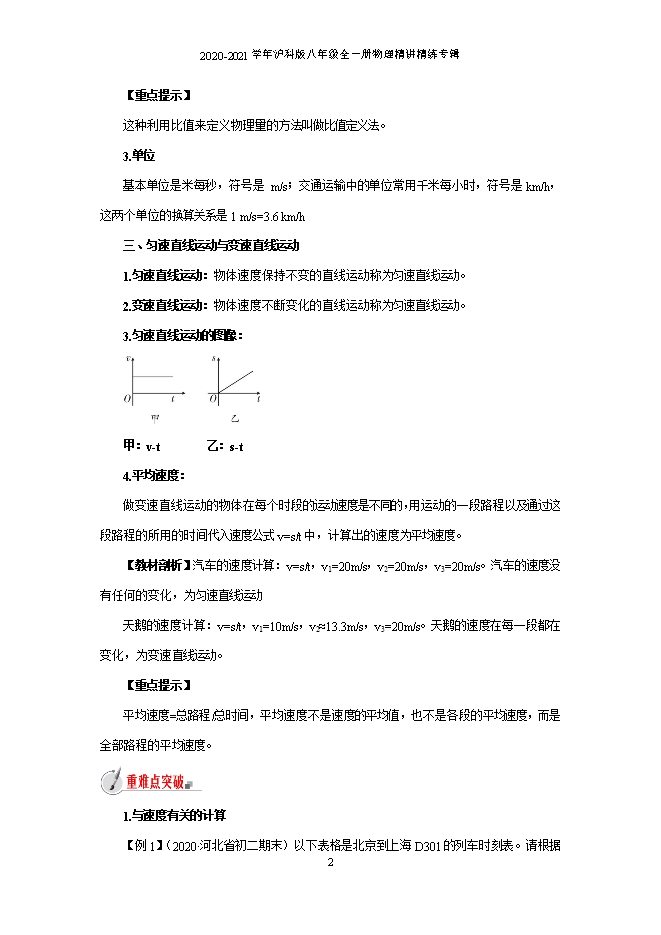 【内容简介】一、比较快慢的方法1.相同的时间比较路程2.相同的路程比较时间3.时间和路程都不相同比较单位时间的路程【重点提示】在比较运动的快慢时,只不过是应用了控制变量法:控制时间相同,比较通过的路程;控制路程相同比较所用的时间。二、速度1.定义在物理学中,将物体在一段时间内通过的路程和通过这段路程所用时间的比称为速度。2.公式速度=路程/时间,v=s/ts表示路程,t表示时间,v表示速度。【重点提示】这种利用比值来定义物理量的方法叫做比值定义法。3.单位基本单位是米每秒,符号是 m/s;交通运输中的单位常用千米每小时,符号是km/h,这两个单位的换算关系是1 m/s=3.6 km/h三、匀速直线运动与变速直线运动1.匀速直线运动:物体速度保持不变的直线运动称为匀速直线运动。2.变速直线运动:物体速度不断变化的直线运动称为匀速直线运动。3.匀速直线运动的图像: 甲:v-t 乙:s-t4.平均速度:做变速直线运动的物体在每个时段的运动速度是不同的,用运动的一段路程以及通过这段路程的所用的时间代入速度公式v=s/t中,计算出的速度为平均速度。【教材剖析】汽车的速度计算:v=s/t,v1=20m/s,v2=20m/s,v3=20m/s。汽车的速度没有任何的变化,为匀速直线运动天鹅的速度计算:v=s/t,v1=10m/s,v2≈13.3m/s,v3=20m/s。天鹅的速度在每一段都在变化,为变速直线运动。【重点提示】平均速度=总路程/总时间,平均速度不是速度的平均值,也不是各段的平均速度,而是全部路程的平均速度。 1.与速度有关的计算【例1】(2020•河北省初二期末)以下表格是北京到上海D301的列车时刻表。请根据列车时刻表回答下列问题:车次站次站名到达时间开车时间运行时间里程/kmD3011北京始发站21:350分0D3012常州06:2906:318h54min1298D3013上海07:39终点站10h4min1463(1)D301次列车由北京到上海全程的平均速度大约是多少千米/小时?(2)某次列车速度为120km/h,如果此列车从北京开往上海,那么从北京到上海坐此列车需要多长时间?【答案】(1)145.3km/h;(2)12.2h【解析】(1)从表中数据可知,D301次列车由北京到上海全程走过的路程大小是 ,全程需要的时间是 那么根据 可知,由北京到上海全程的平均速度大约是 D301次列车由北京到上海全程的平均速度大约是 。(2)根据 可知,从北京到上海坐此列车需要的时间是 从北京到上海坐此列车需要的时间大约是 。答:(1)D301次列车由北京到上海全程的平均速度大约是 ;(2)某次列车速度为120km/h,如果此列车从北京开往上海,那么从北京到上海坐此列车需要的时间大约是 。